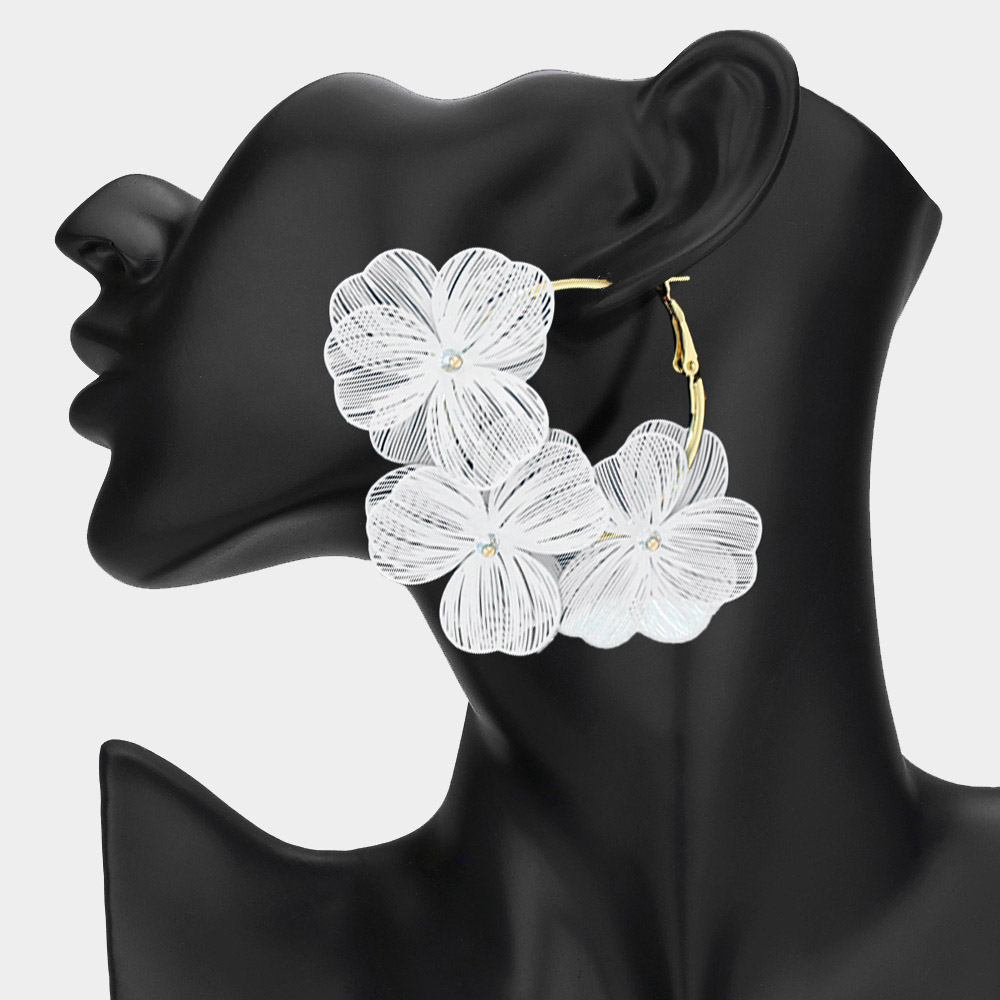 • Make a bold impression with these white triple-bloom floral earrings. Lightweight and artistic, they add a dramatic yet elegant touch to your look. Perfect for fashion-forward styling and standout occasions.