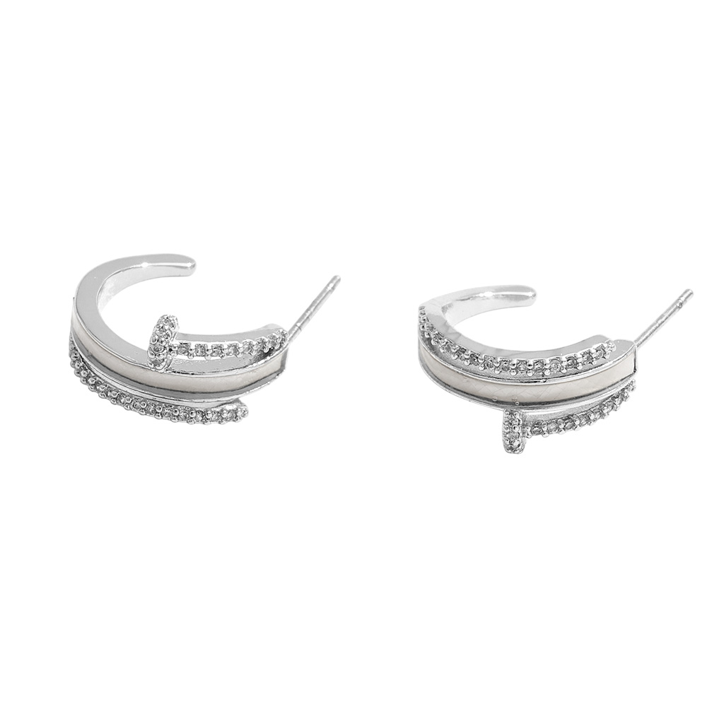 White Gold Dipped CZ Stone Paved Nail Head Mother of Pearl Inlay Mini Hoop Earrings