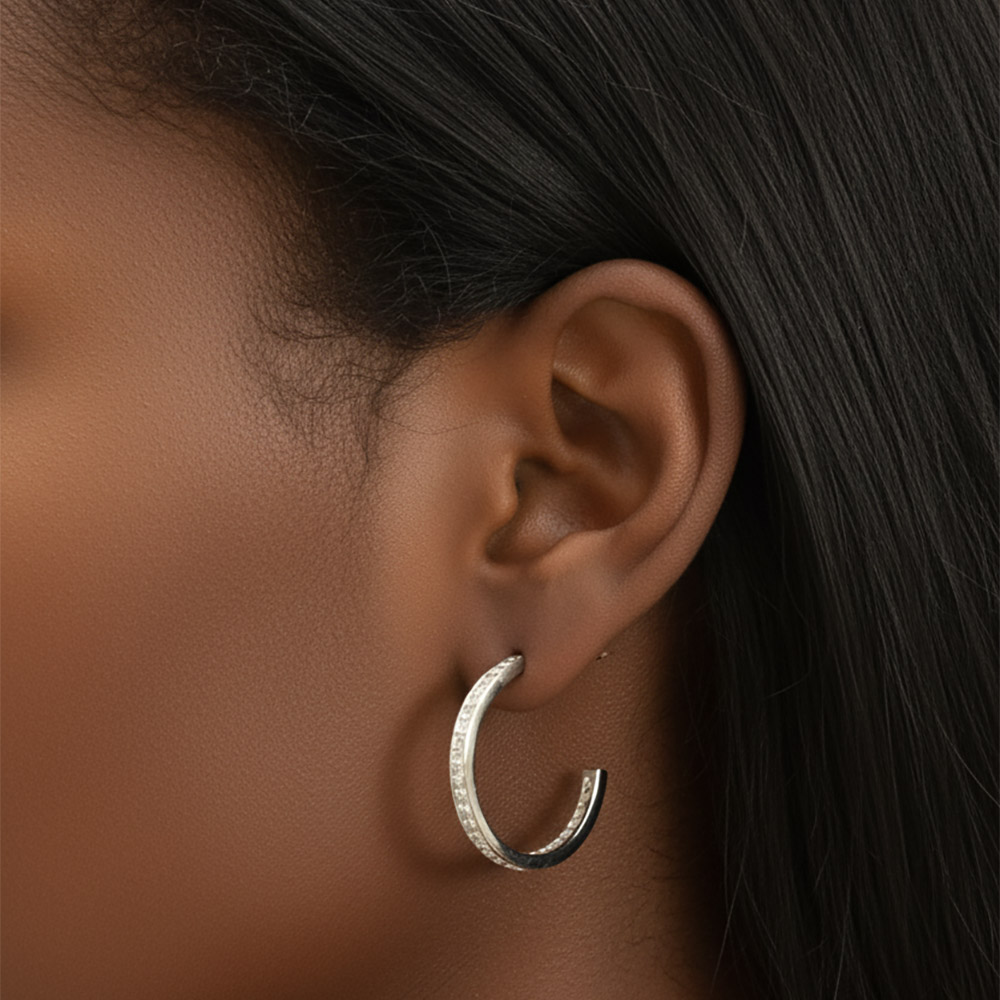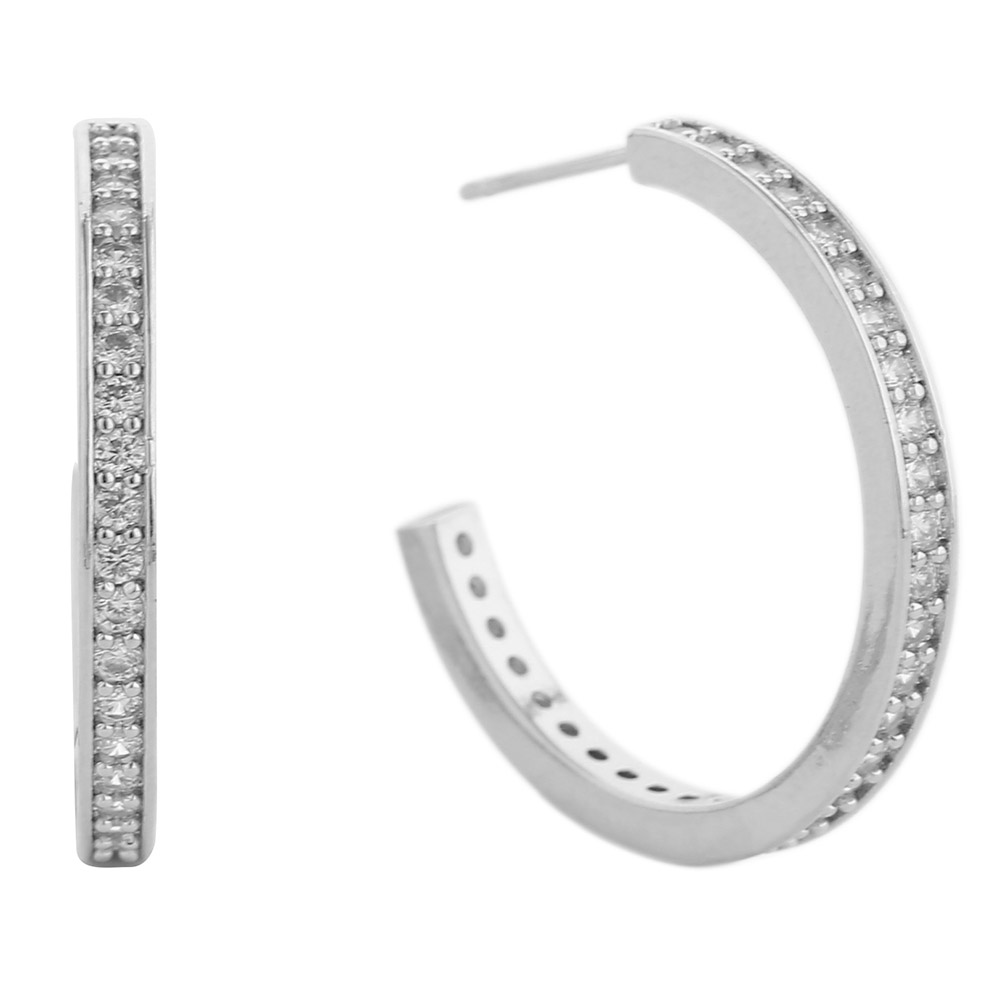 Details • Size : 1" X 1" • Post Back • Modern half hoop earrings designed with a clean silhouette and refined shine. Effortlessly versatile, they bring understated elegance to both everyday wear and special occasions, making them a timeless jewelry box essential. • Brass • CZ Cubic Zirconia • Gold Dipped • Hypoallergenic • Lead and Nickel Compliant • Made In Korea