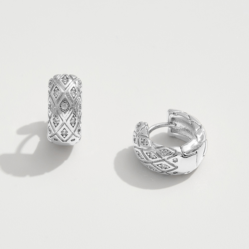 Details • Size : 0.6" X 0.7" X 0.3" • Huggie Back • These huggie hoop earrings feature a quilted diamond-pattern design accented with sparkling CZ stones for a chic, elevated look. A perfect blend of texture and shine, they bring timeless sophistication to your everyday wear and make a versatile addition to your jewelry collection. • Brass • CZ Cubic Zirconia • Gold Dipped • Hypoallergenic • Lead and Nickel Compliant • Made In Korea
