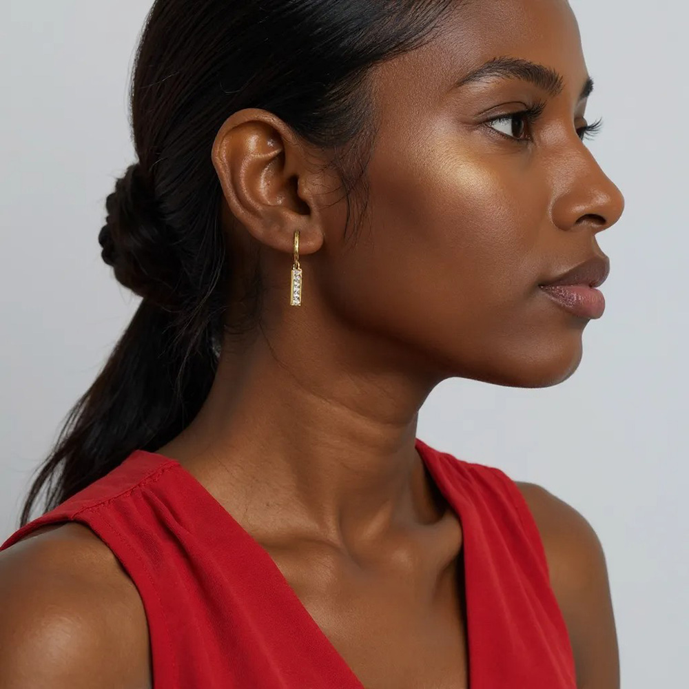 Details • Size : 0.5" X 1.1" • Huggie Back • These chic hoop earrings feature sleek bar-shaped dangles lined with sparkling cubic zirconia stones for a refined, modern look. Lightweight and versatile, they bring a perfect balance of minimalism and elegance, making them a stunning accessory for everyday wear or evening occasions. • Brass • CZ Cubic Zirconia • Gold Dipped • Hypoallergenic • Lead and Nickel Compliant • Made In Korea
