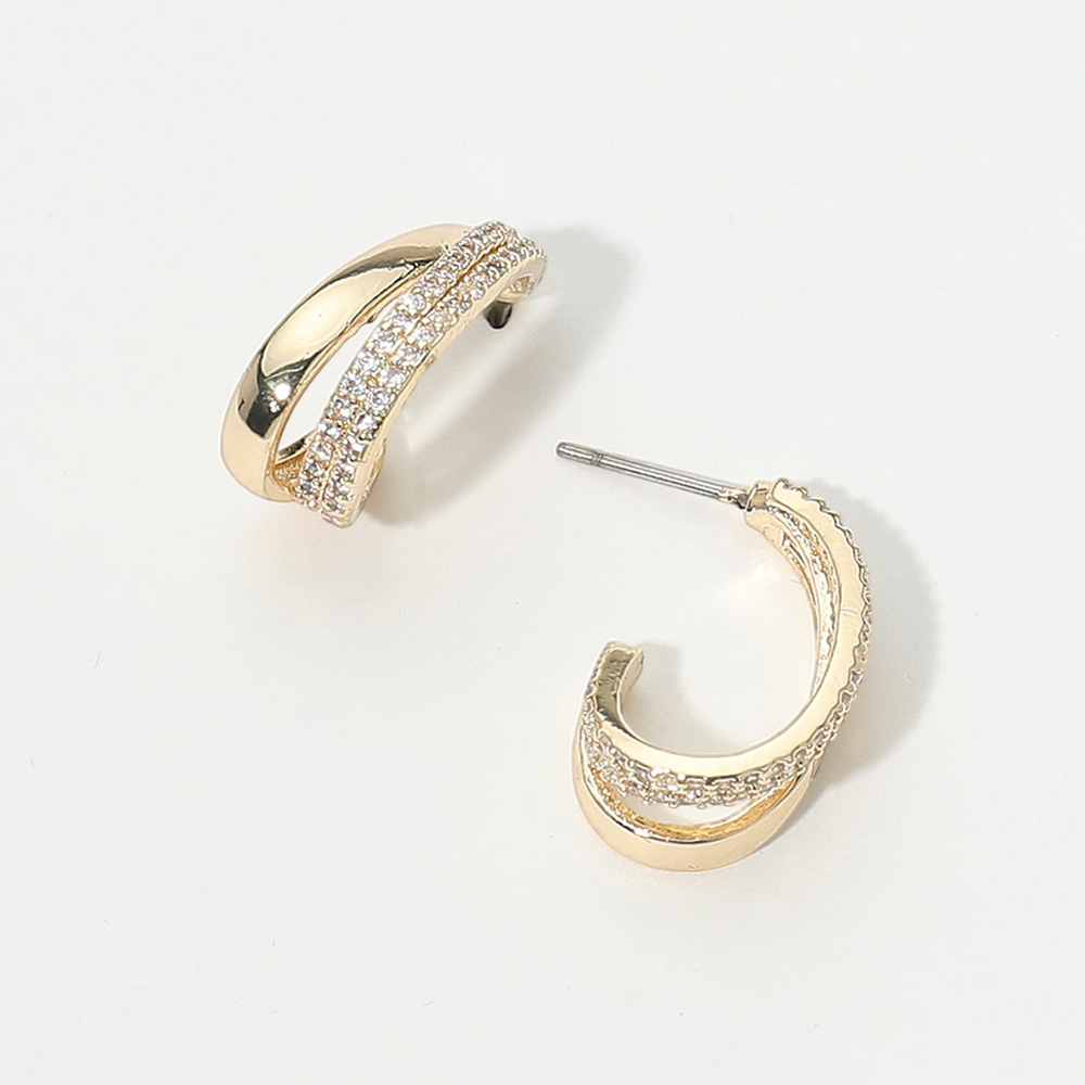 Details • Size : 0.8" X 0.75" X 0.3" • Post Back • Shine with sophistication in these curved hoop earrings featuring a sleek design enhanced with sparkling crystal pave accents. Perfect for adding elegance to casual or formal looks, these stylish earrings offer a modern twist on a timeless classic, making them a must-have for any jewelry lover. • CZ Cubic Zirconia • Gold Dipped