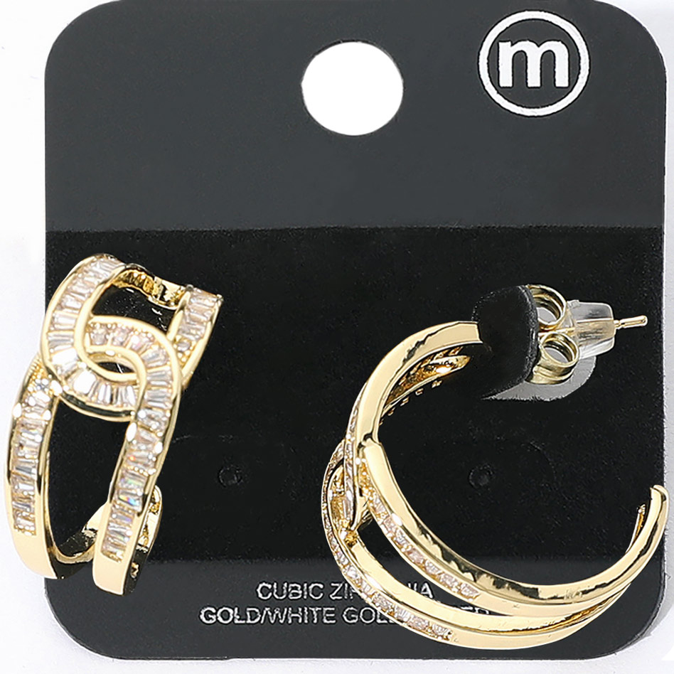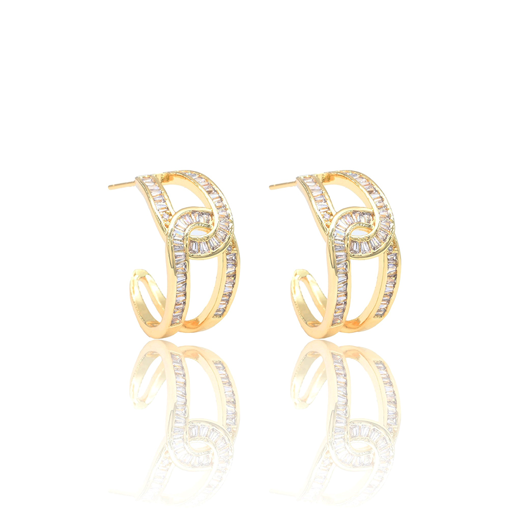 • Stylish hoop earrings with an interlocking loop design, encrusted with radiant cubic zirconia stones and finished in gold-tone plating. A dazzling accessory perfect for elevating any elegant or casual look.