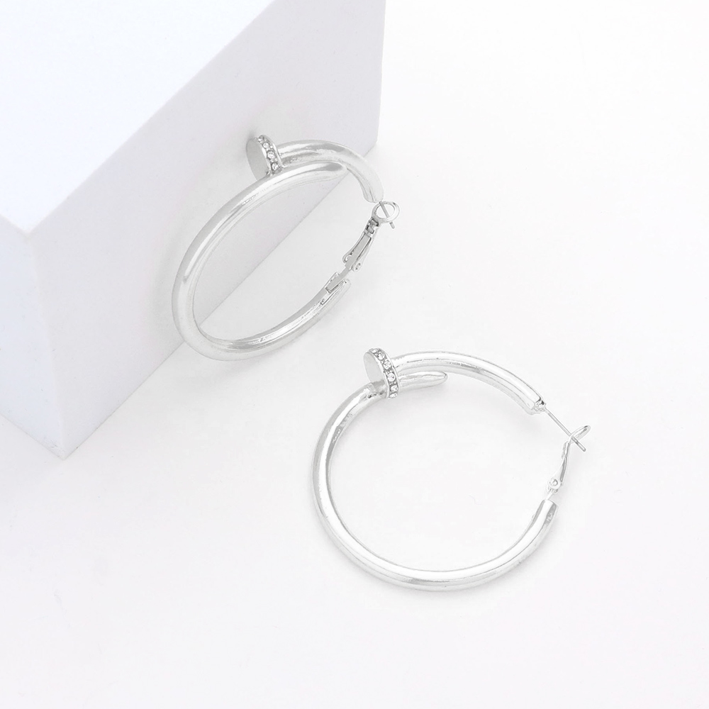 Rhinestone Embellished 2 Inch Metal Nail Hoop Earrings