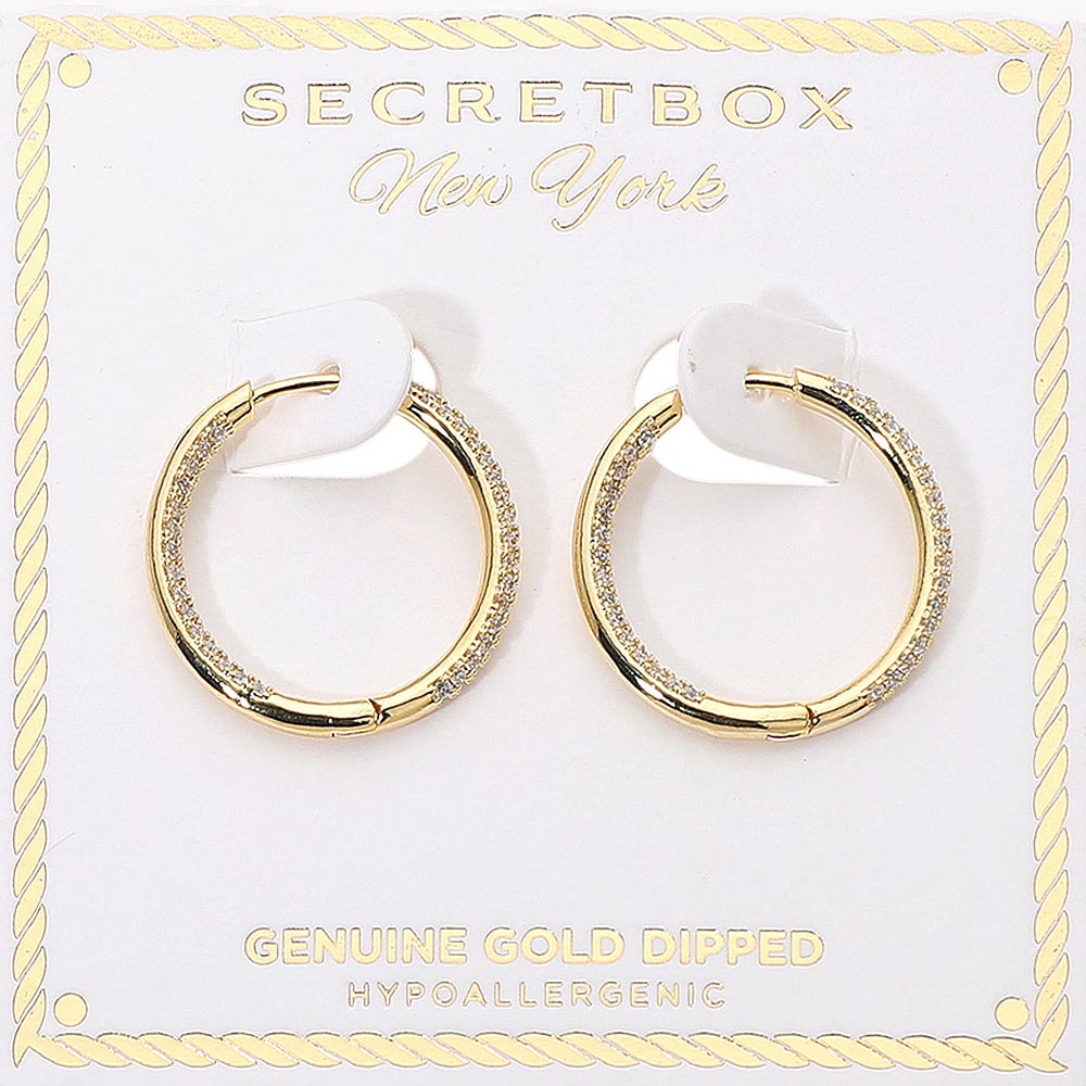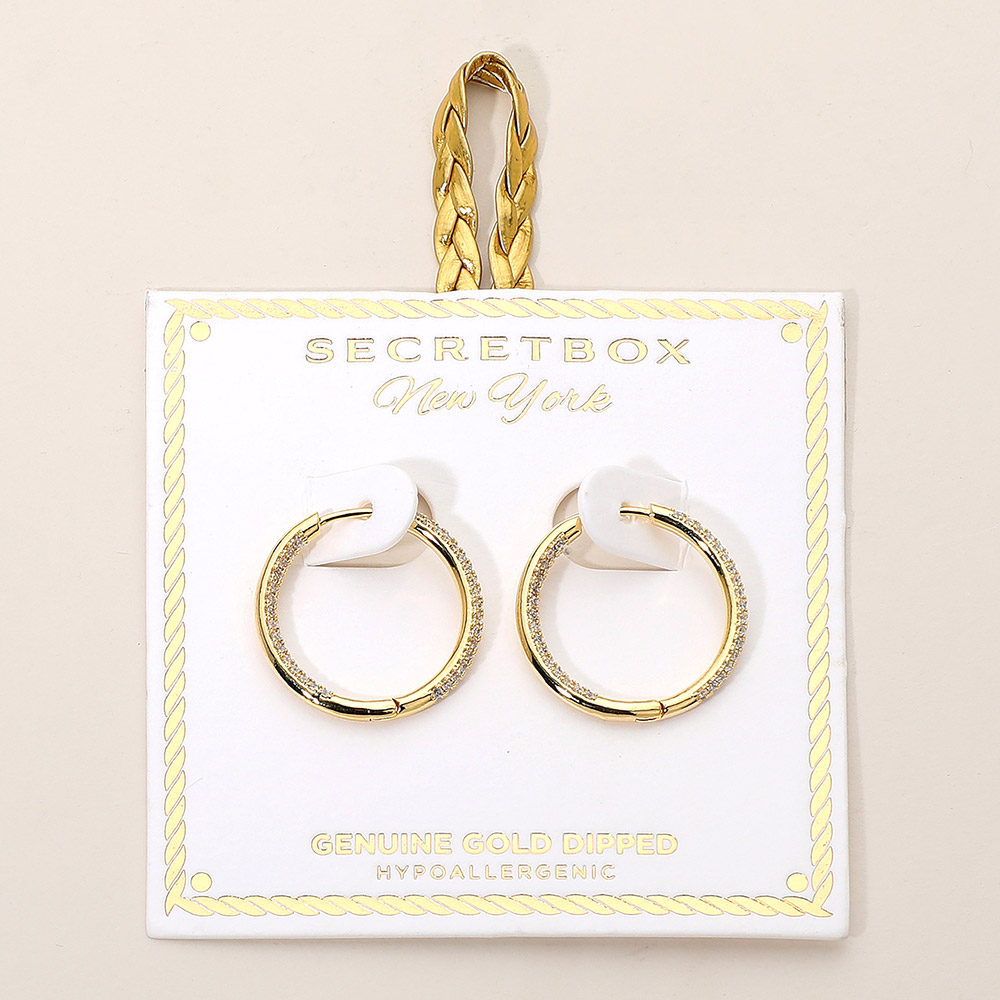 Details • Size : 1" X 1" • Huggie Back • Stylish dipped hoop earrings with a sleek and sparkling finish designed for everyday elegance. Hypoallergenic and beautifully packaged in exclusive Secret Box New York presentation, they offer a refined touch for both casual and dressy looks, making them a perfect gift or personal accessory. • Hypoallergenic • Gold Dipped