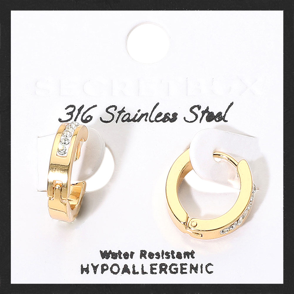 Details • Size : 0.7" X 0.7" X 0.2" • Huggie Back • Mini hoop earrings crafted in stainless steel with sparkling crystal accents, offering a chic everyday huggie style. Water-resistant and hypoallergenic for comfortable wear. A versatile pair designed for a polished, modern look suitable for any occasion. • Hypoallergenic • Stainless Steel