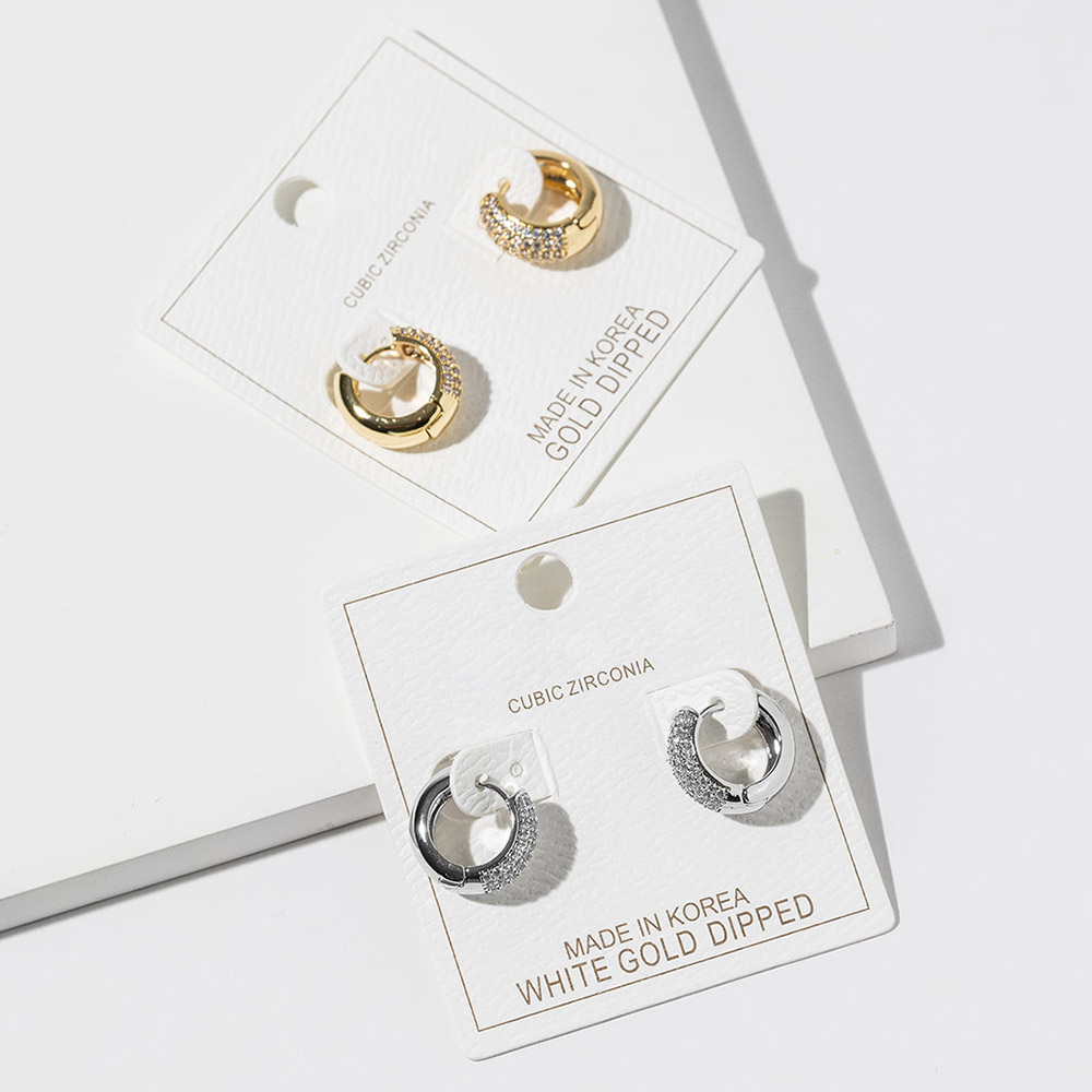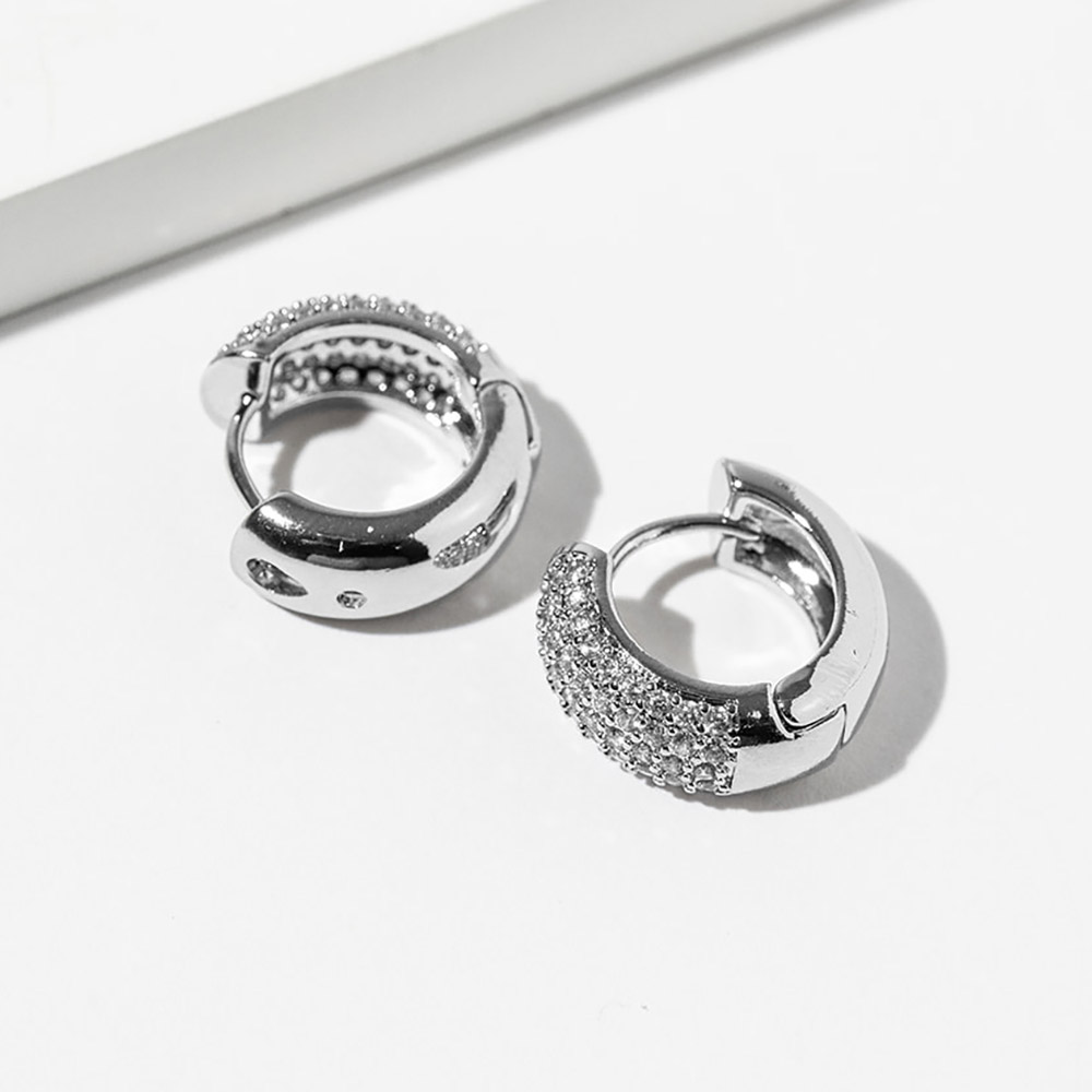 • Classic pavĂ© huggie hoop earrings featuring a compact rounded silhouette with shimmering accent stones and a secure hinged closure. Designed for everyday wear, work styling, and special occasions, these earrings deliver timeless elegance, subtle sparkle, and versatile appeal for any jewelry collection.