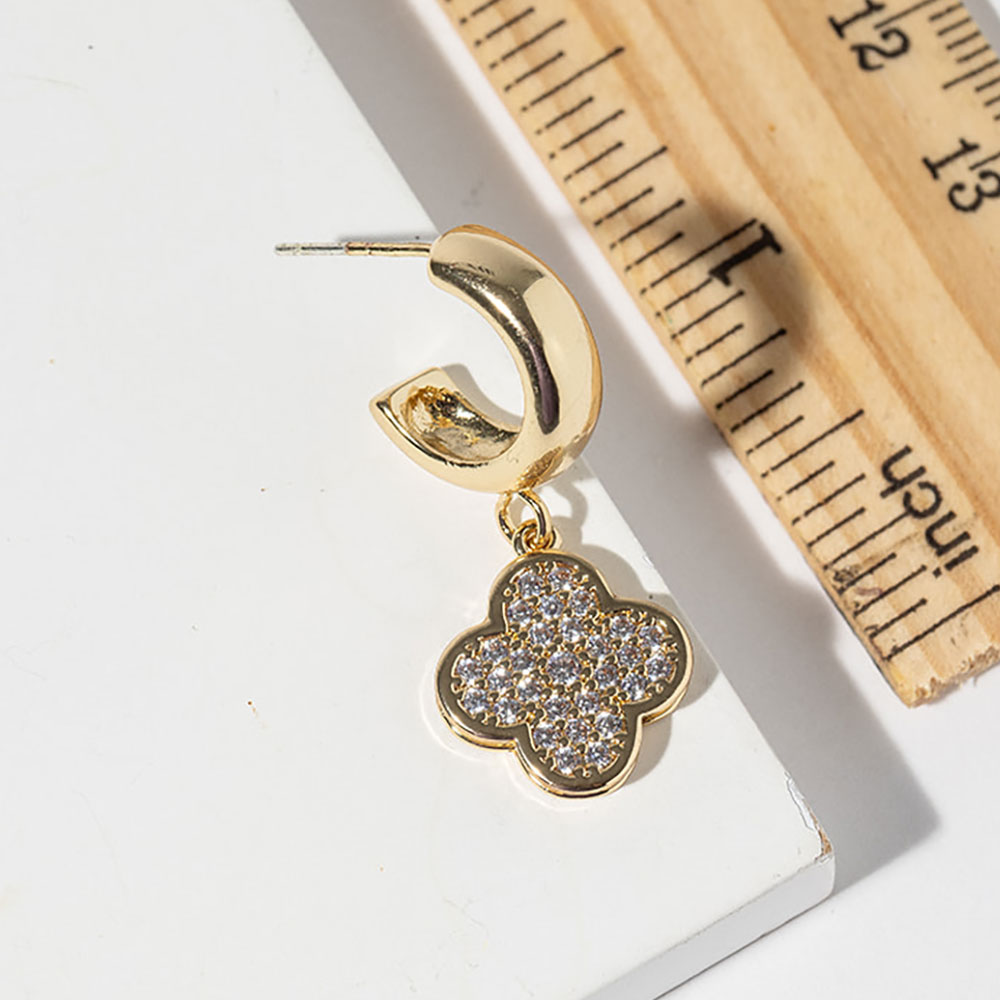 Gold Dipped CZ Stone Paved Quatrefoil Drop Dangle Mini Hoop Earrings