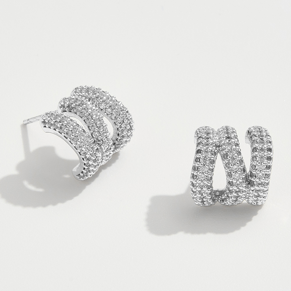 White Gold Dipped CZ Stone Paved Triple Row Half Hoop Small Earrings