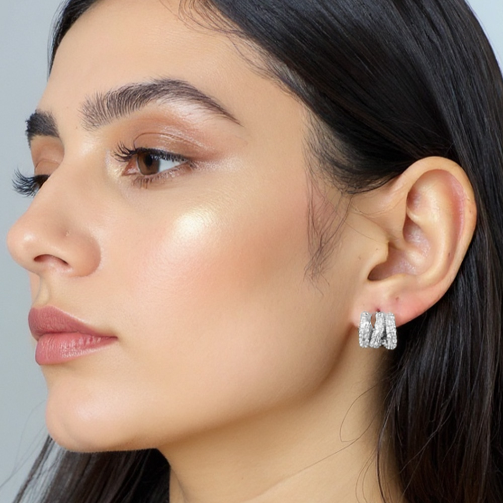 • Elevate your look with these triple row crystal hoop earrings, featuring dazzling pavĂ© detailing for maximum sparkle. Their bold yet elegant design makes them a versatile choice for evening wear, special occasions, or adding a touch of glam to everyday outfits.