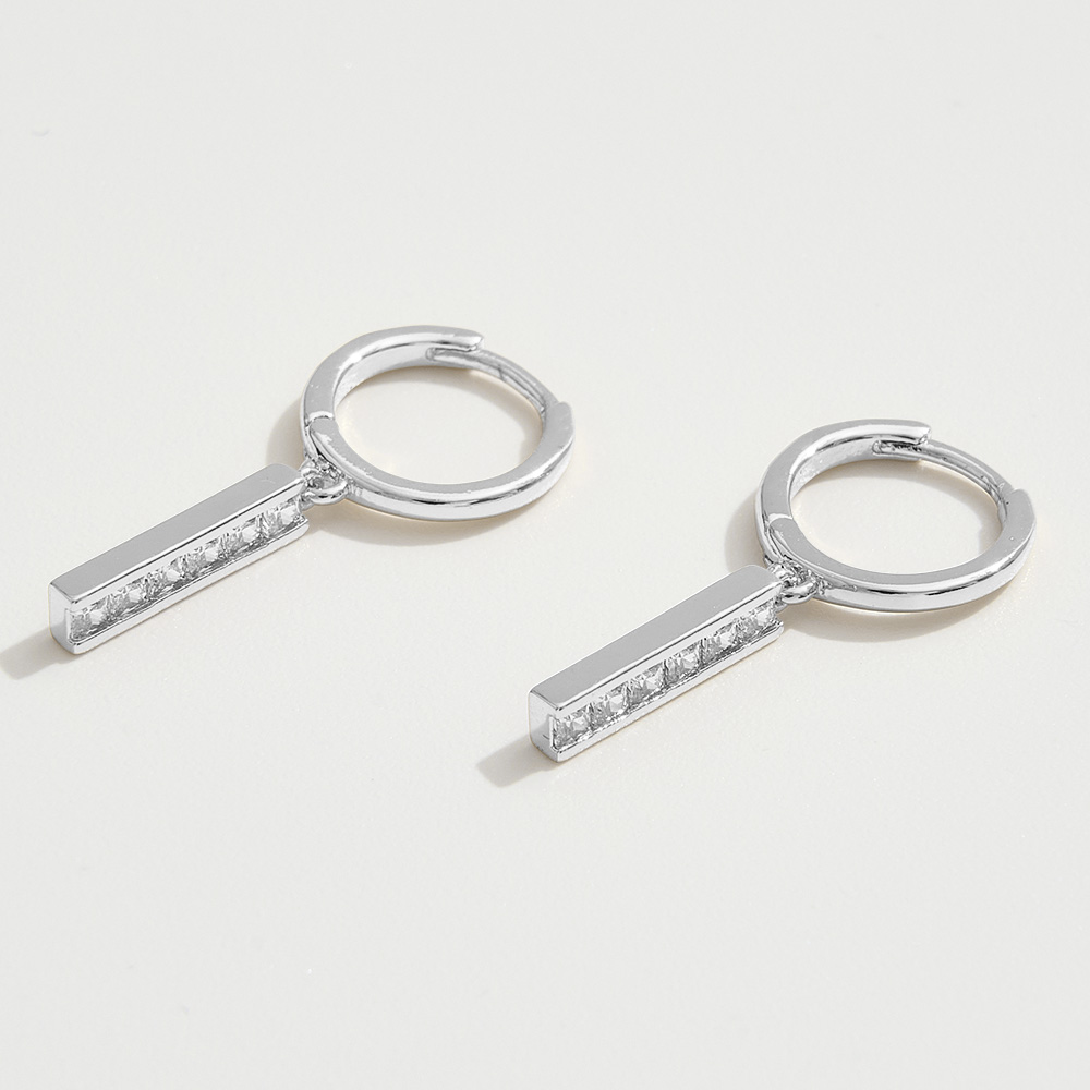 Details • Size : 0.5" X 1.1" • Huggie Back • These chic hoop earrings feature sleek bar-shaped dangles lined with sparkling cubic zirconia stones for a refined, modern look. Lightweight and versatile, they bring a perfect balance of minimalism and elegance, making them a stunning accessory for everyday wear or evening occasions. • Brass • CZ Cubic Zirconia • Gold Dipped • Hypoallergenic • Lead and Nickel Compliant • Made In Korea