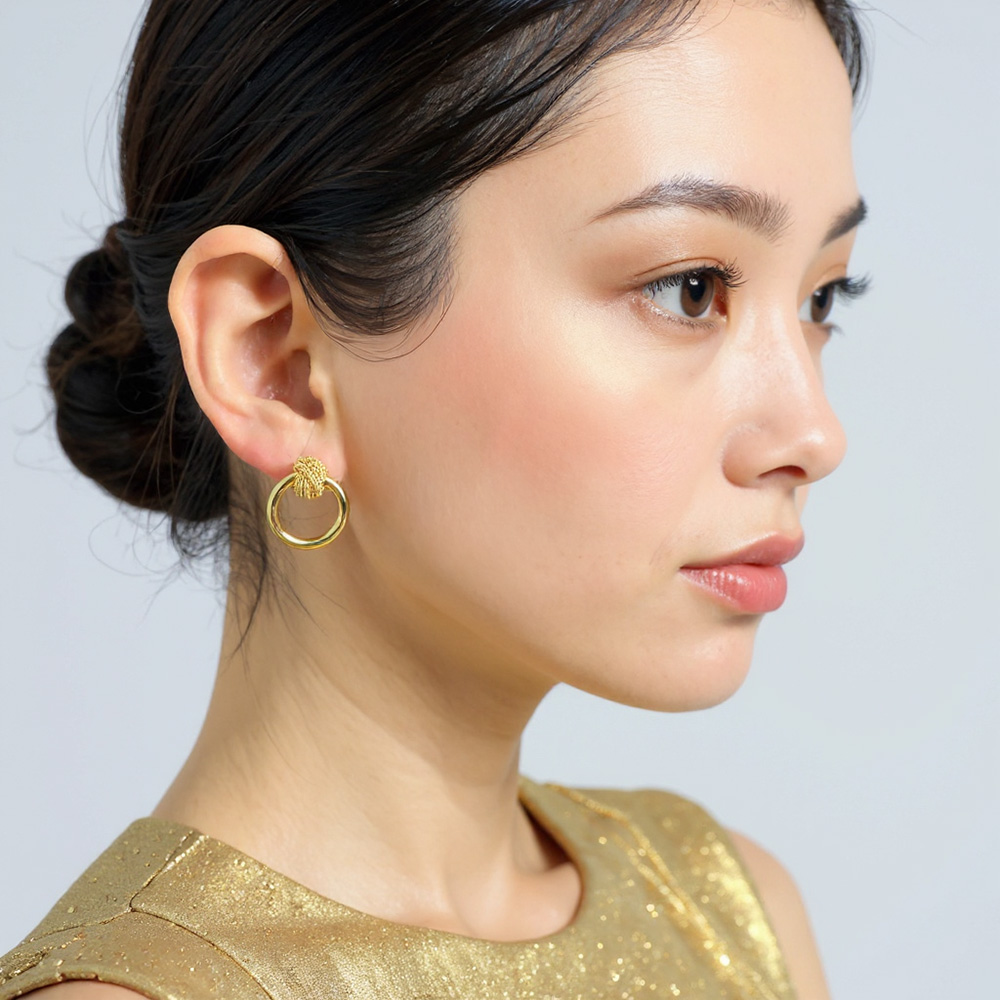 Details • Size : 0.7" X 0.75" • Post Back • These chic knot and hoop earrings showcase a textured knot detail paired with a smooth circular hoop, creating a stylish balance of boldness and elegance. Ideal for both casual and dressy outfits, they add a modern yet timeless accent to your jewelry collection. • Brass • Gold Dipped • Hypoallergenic • Lead and Nickel Compliant • Made In Korea