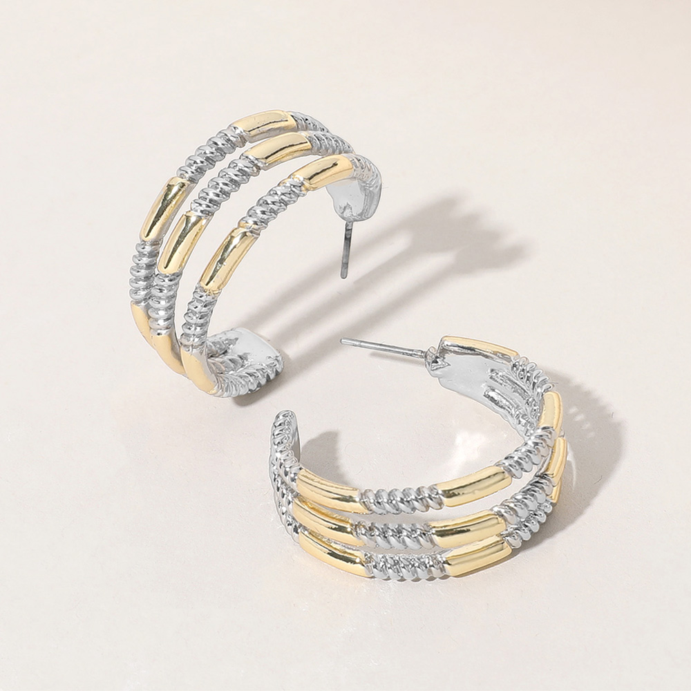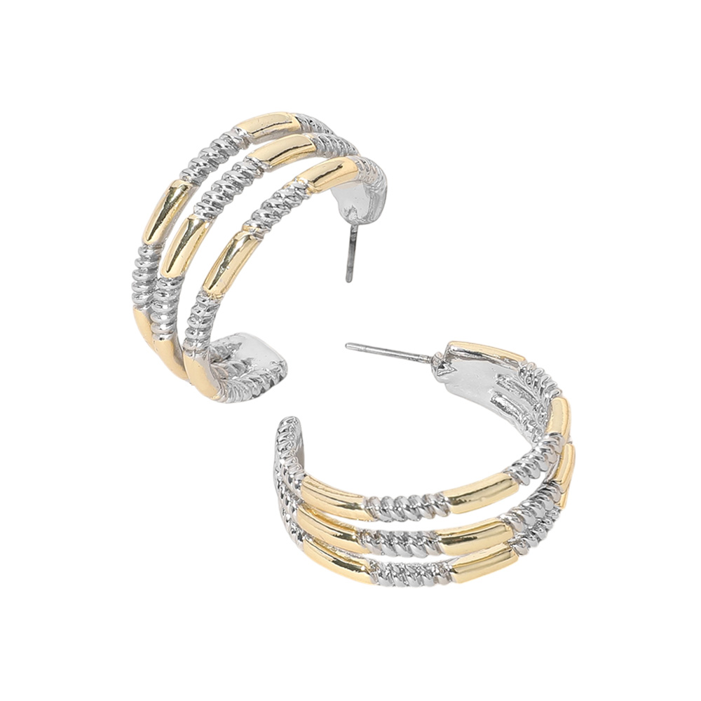 • Bold hoop earrings with silver and gold-tone ribbed stripes. Lightweight yet eye-catching design for daily glam or evening shine. Post back closure.