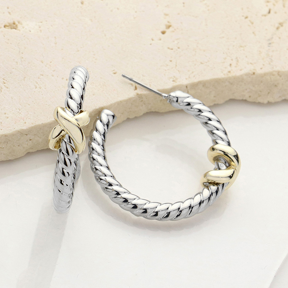 Details • Size : 1.25" X 1.2" X 0.3" • Post Back • These elegant hoop earrings feature a classic rope twist design highlighted by a sleek knot accent. A versatile accessory that blends timeless charm with modern flair, ideal for both casual and formal outfits. • Gold Dipped