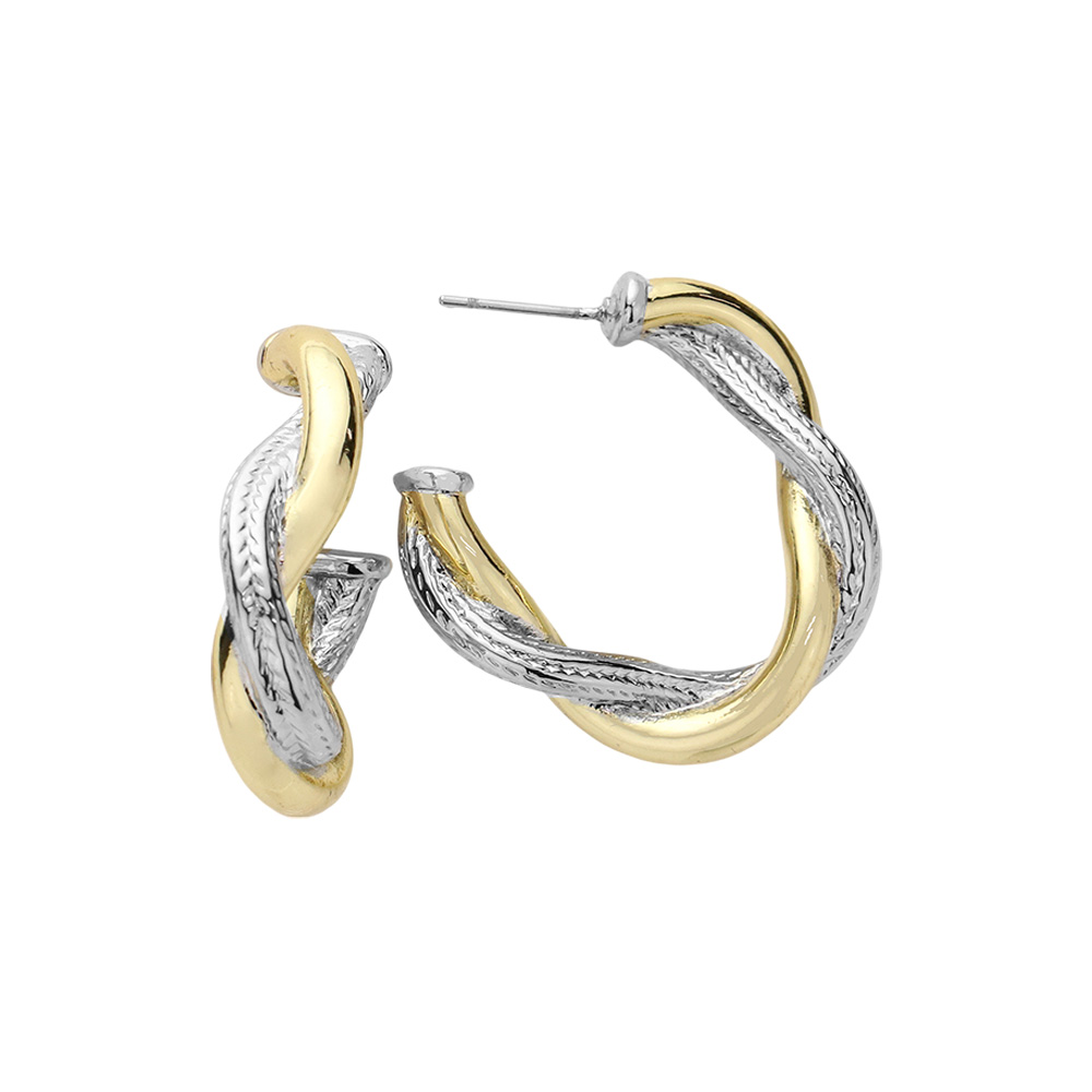 Details • Size : 1.25" X 1.2" X 0.3" • Post Back • Stylish twist hoop earrings featuring a braided dual tone design for a modern yet elegant look. These hoops add dimension and texture, making them perfect for elevating everyday or dressy ensembles. • Gold Dipped
