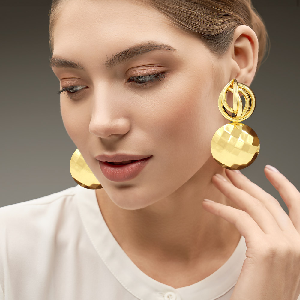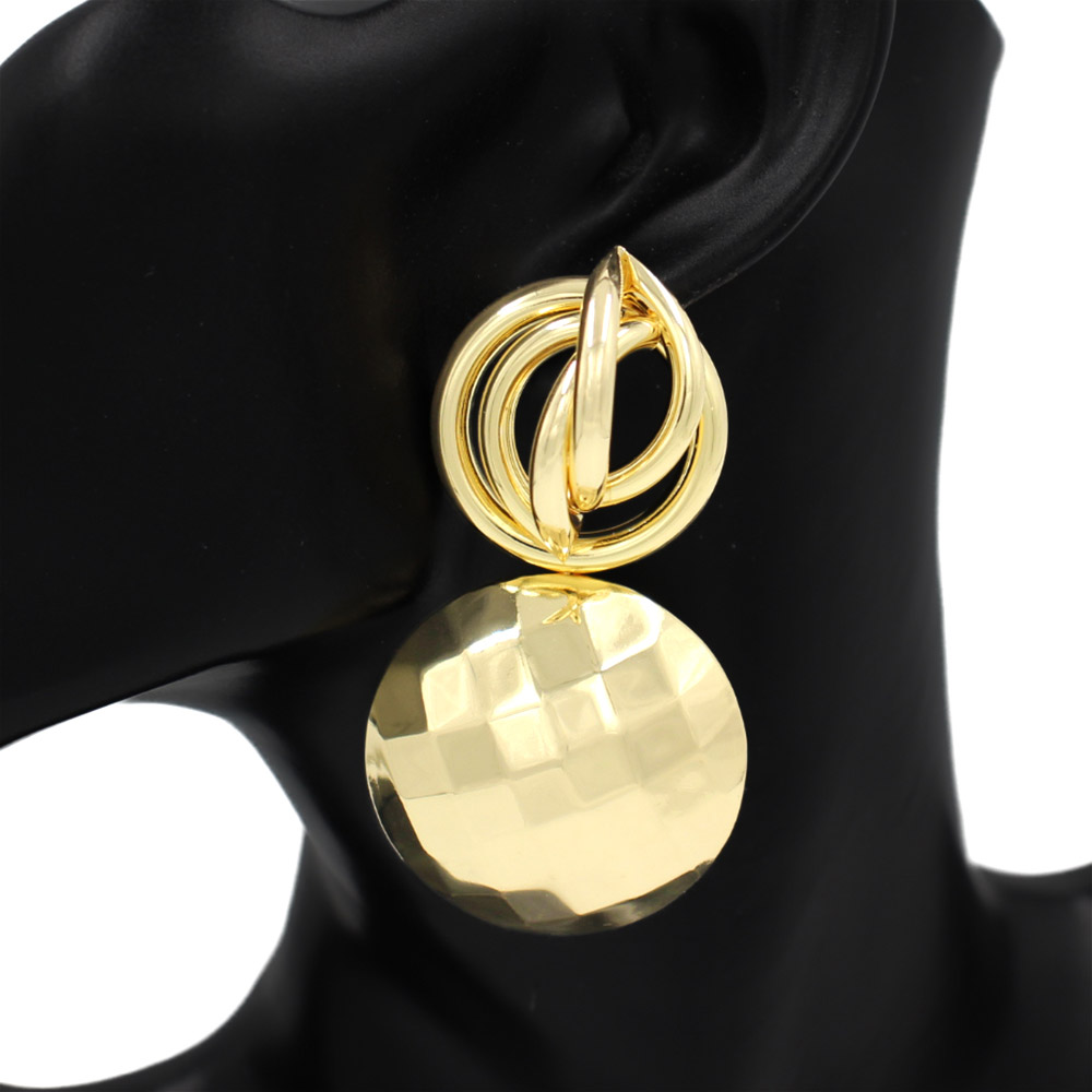 Details • Size : 1.5" X 3" • Post Back • Bold hammered disc drop earrings featuring a sculptural layered design that adds movement and shine. These eye-catching statement earrings elevate everyday looks and dressy outfits alike, offering a modern accessory that delivers standout style for any occasion. • Lead and Nickel Compliant