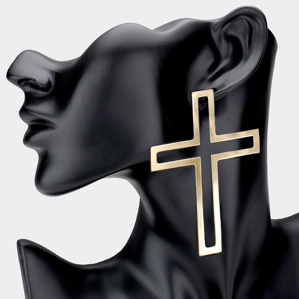 Details • Size : 2.4" X 3.2" • Post Back • Express bold style with these modern cross drop statement earrings featuring a sleek open outline and elongated silhouette for striking movement. Comfortable yet eye-catching, they elevate everyday looks or add dramatic edge to night styling for fashion-forward accessorizing with symbolic flair. • Lead and Nickel Compliant