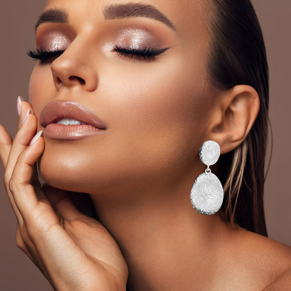 Details • Size : 1" X 2.2" • Post Back • Elevate any look with these textured disc drop earrings featuring a bold, sculptural silhouette that adds modern artistic flair. Their dimensional design creates eye-catching movement, making them a standout accessory perfect for both everyday outfits and elevated occasions. • Lead and Nickel Compliant
