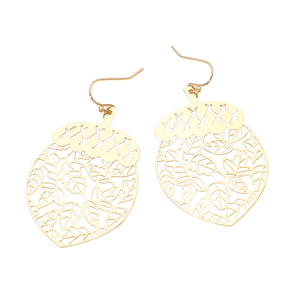 Details • Size : 1.4" X 2.4" • Fish Hook Back • Add a touch of woodland charm with these leafy acorn cutout drop earrings. Designed with intricate leaf patterns and a delicate acorn silhouette, they bring nature-inspired elegance to any outfit. Perfect for casual wear or dressing up with a whimsical and stylish flair. • Brass • Lead and Nickel Compliant