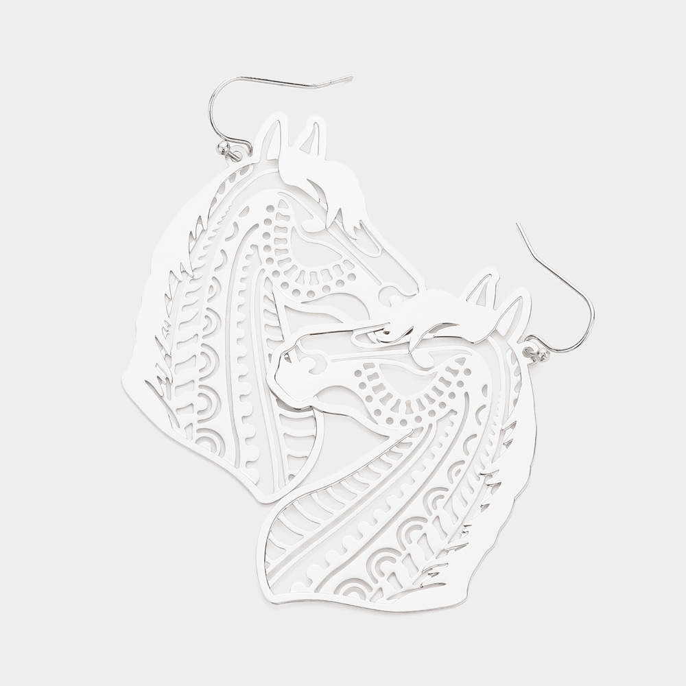 • Showcase your bold and artistic style with these beautifully detailed horse silhouette dangle earrings. Featuring intricate cut-out patterns, they blend elegance with a touch of whimsy. Lightweight and eye-catching, they make the perfect statement piece for any outfit or occasion.