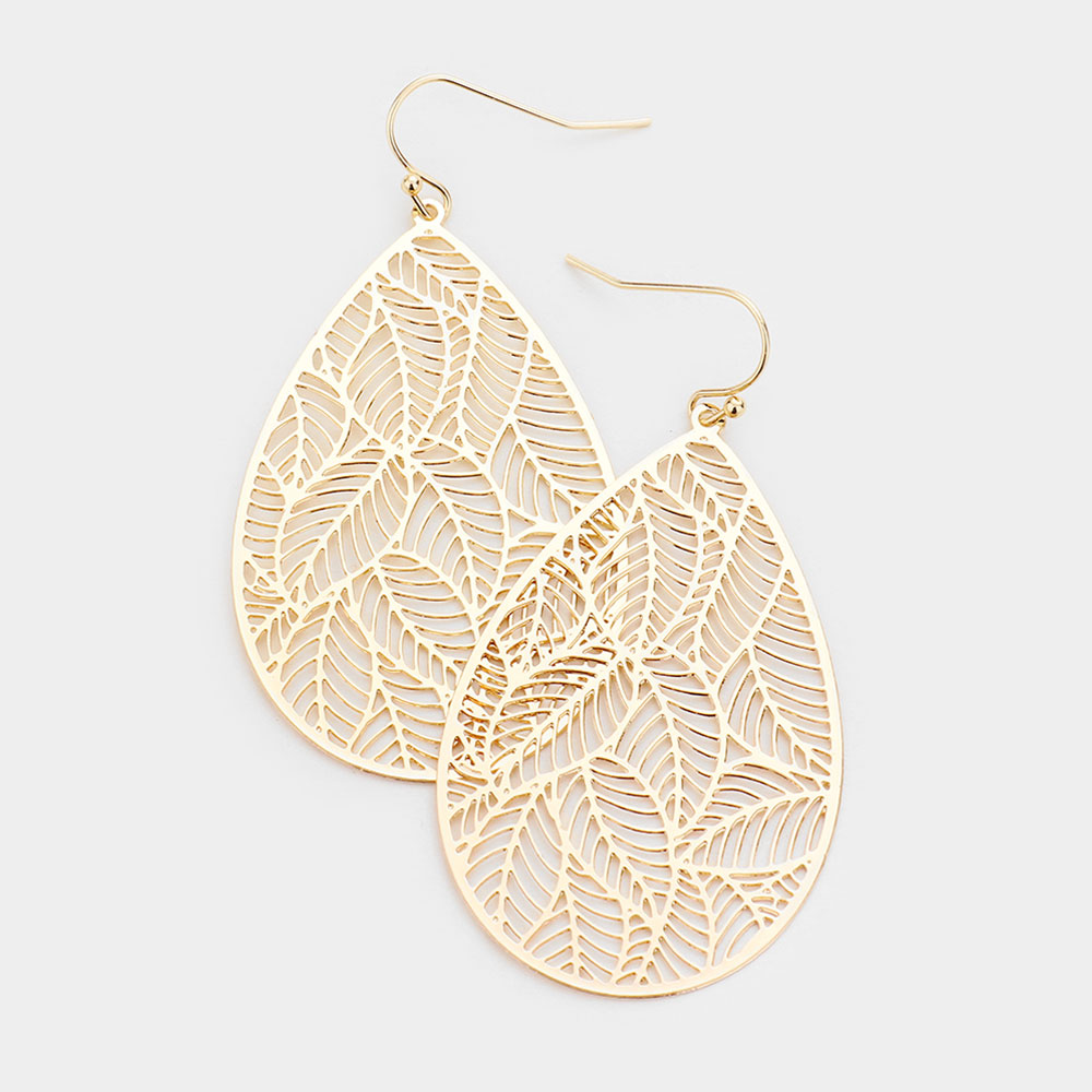 Filigree Leaf Detail Brass Metal Teardrop Dangle Earrings