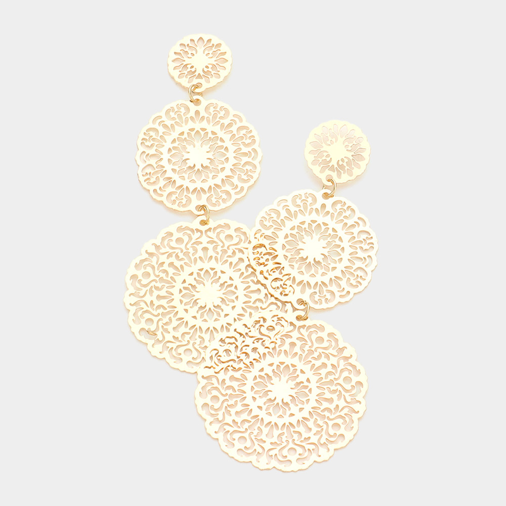 Filigree Flower Leaf Detailed Brass Metal Marquise Dangle Earrings