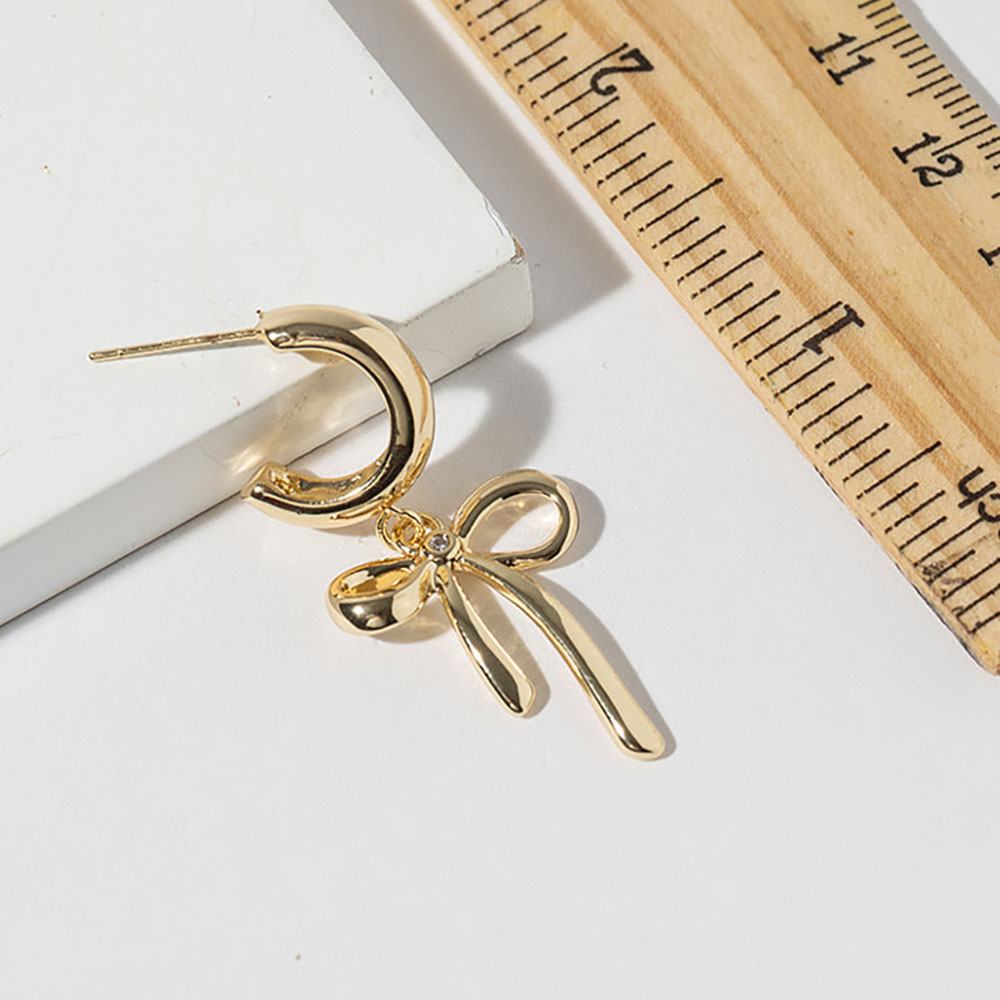 Details • Size : 0.75" X 1.5" • Elegant crescent hoop earrings accented with a smooth bow drop that adds soft movement and feminine charm. The balanced silhouette blends modern curves with a classic bow detail, making these earrings easy to style for everyday wear, gifting, and boutique collections seeking timeless yet playful jewelry designs. • Gold Dipped • Lead and Nickel Compliant • Made In Korea • Sterling Silver Post