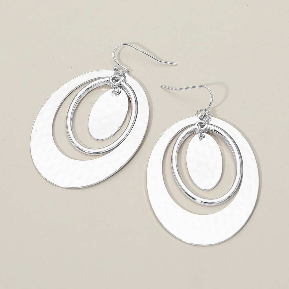 Details • Size : 1.4" X 2.25" • Fish Hook Back • Elevate your accessory game with these textured oval layered dangle earrings. Featuring interlocking open ovals with a subtle hammered finish, they blend modern sophistication with timeless elegance. Perfect for adding movement and shine to both casual and dressy looks. • Lead and Nickel Compliant