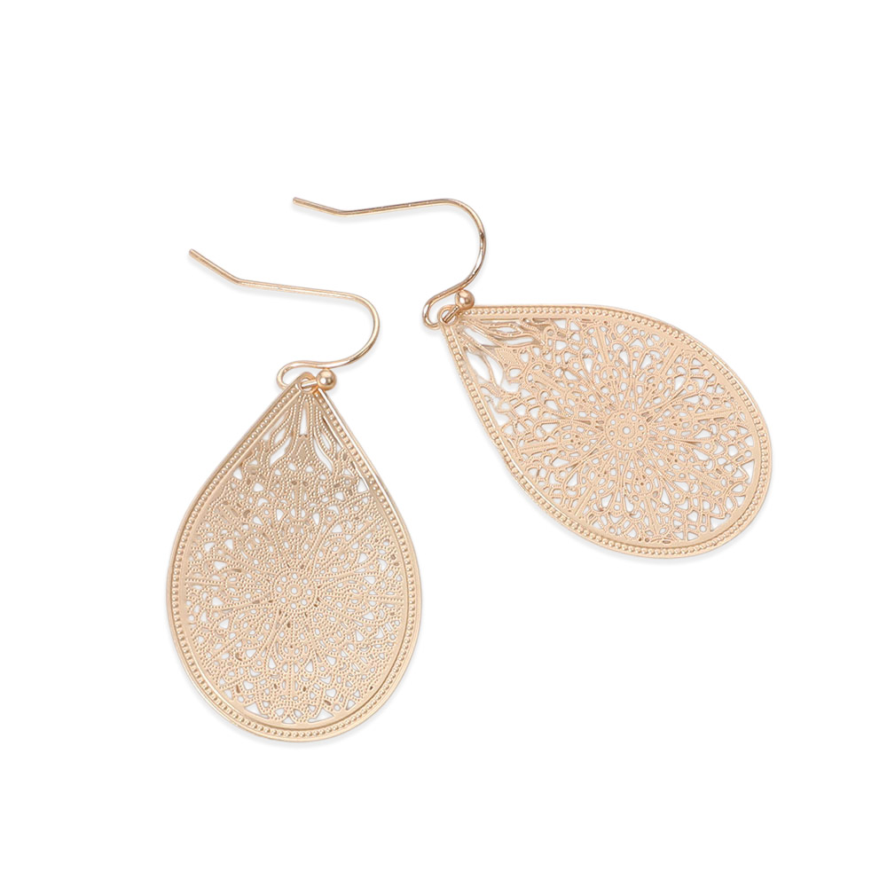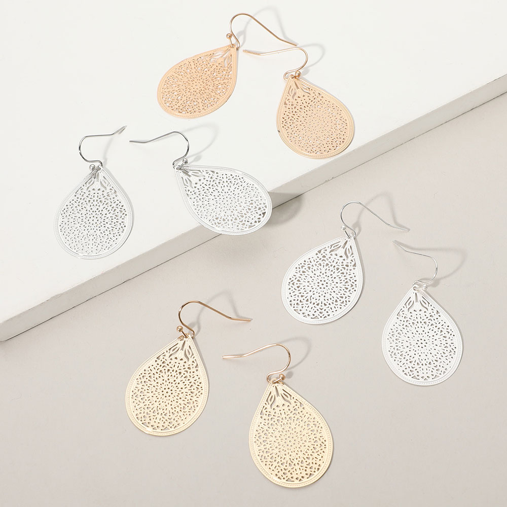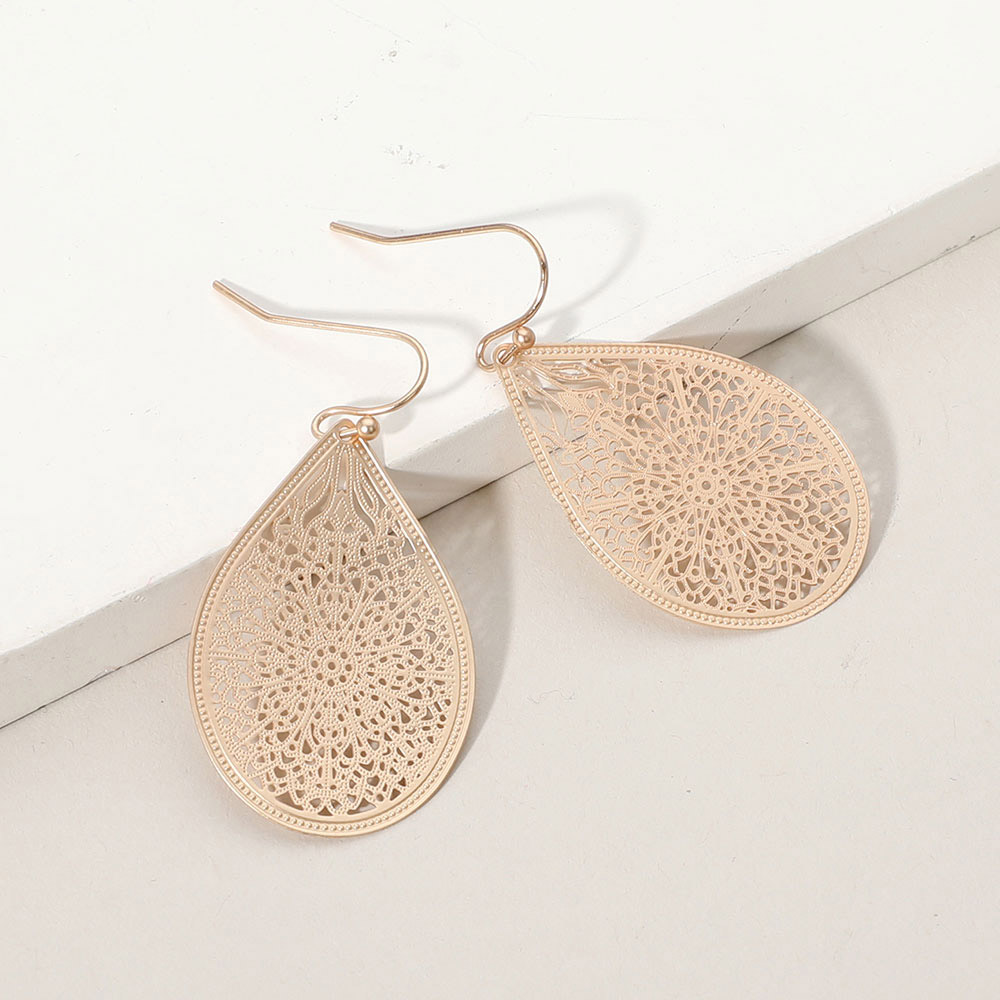 Brass Matte Metal Filigree Teardrop Dangle Earrings