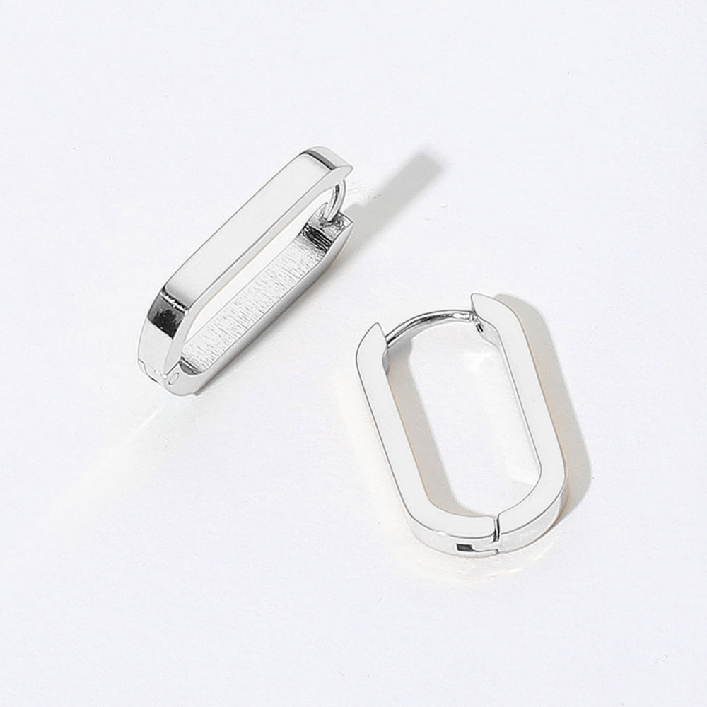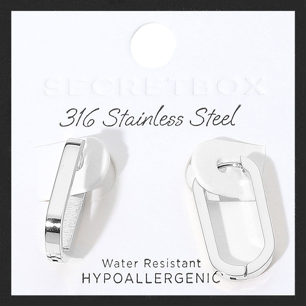 Details • Size : 0.5" X 0.8" • Huggie Back • Water Resistant • Streamlined rectangular huggie earrings deliver a fresh twist on a classic hoop silhouette. Compact, lightweight, and easy to style, they provide polished everyday wear that transitions smoothly from casual looks to evening outfits, perfect worn solo or layered for subtle statement appeal. • Hypoallergenic • Stainless Steel