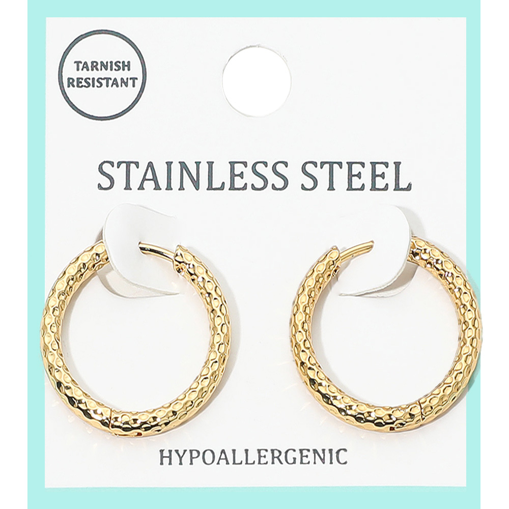 Details • Size : 0.8" X 0.8" • Huggie Back • Tarnish Resistant • These hammered hoop earrings showcase a unique textured design that adds depth and character to any outfit. Lightweight and versatile, they are perfect for elevating both casual and dressy looks, making them a stylish and timeless accessory for everyday fashion. • Hypoallergenic • Stainless Steel