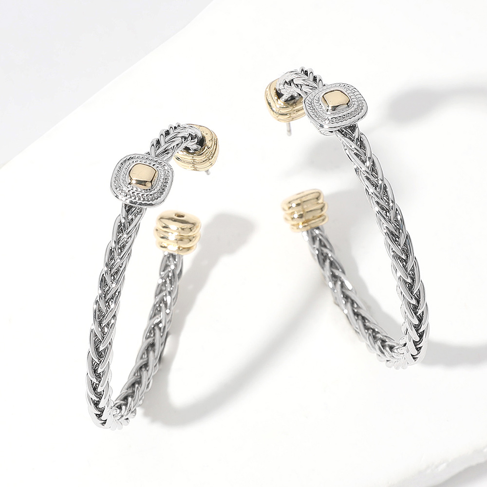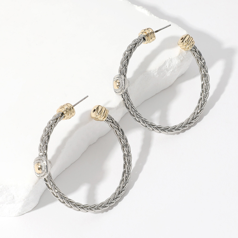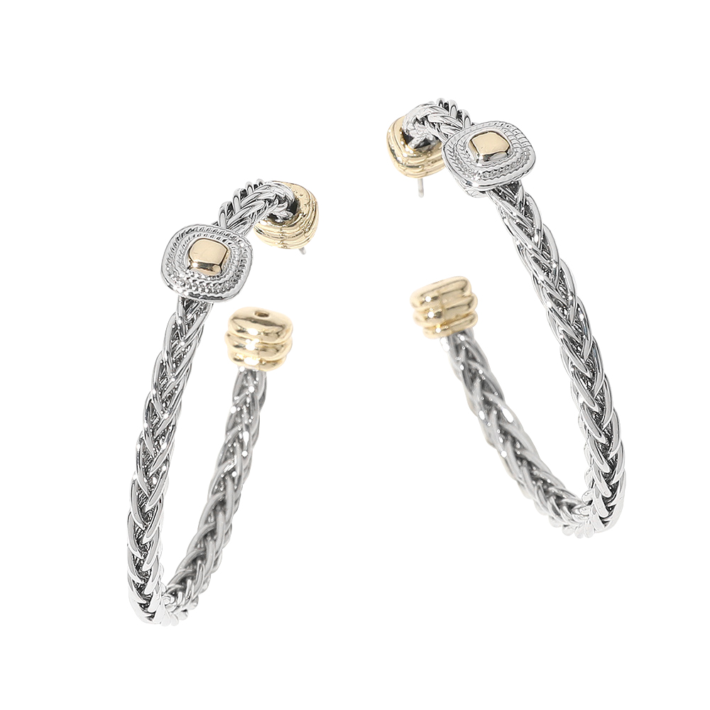 Details • Size : 1.75" X 1.75" • Post Back • Sleek braided hoop earrings featuring gold-tone oval medallions and ridged accents. Lightweight and bold with a polished two-tone finish—perfect for everyday edge or night-out glam.