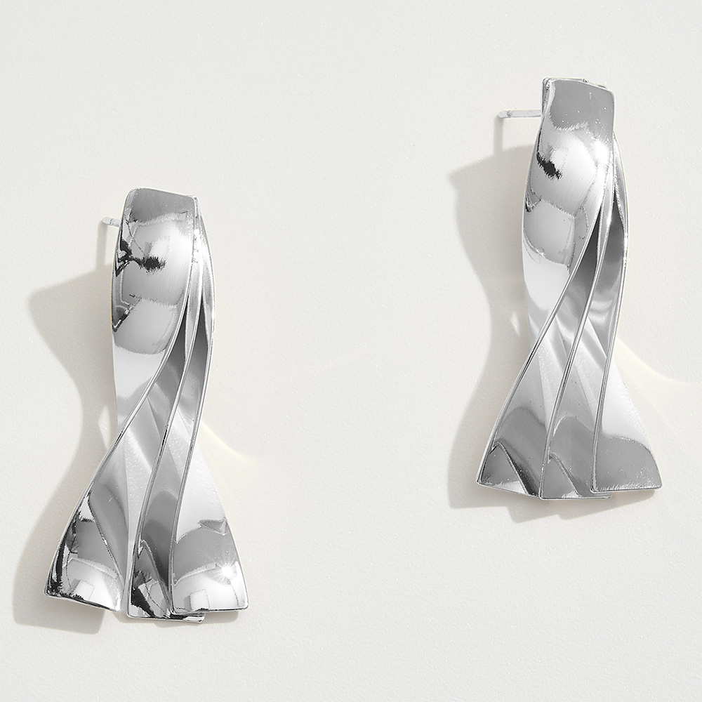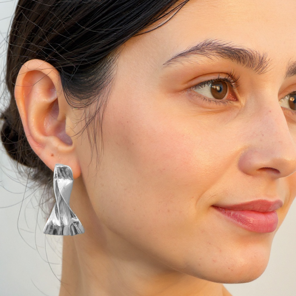 • Bold sculpted twist drop earrings featuring a sleek, flowing design that captures light beautifully. Perfect for making a modern statement, these earrings add sophistication and artistic flair to both casual and evening looks.