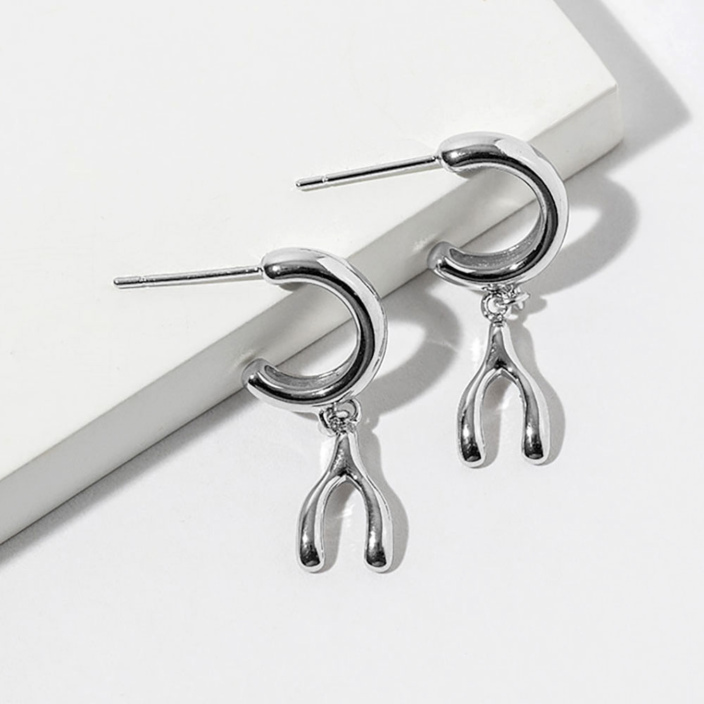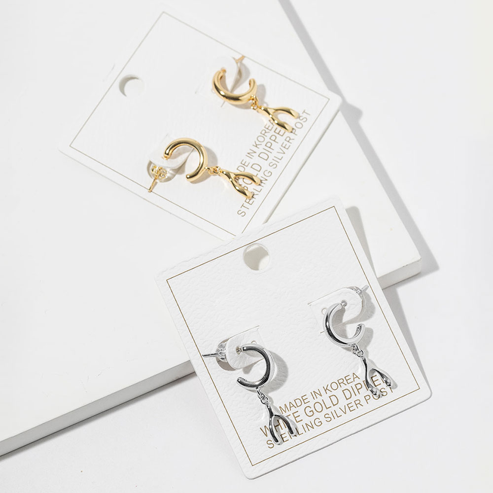 Details • Size : 0.5" X 1" • Crescent hoop drop earrings featuring a sleek curved silhouette accented with a delicate wishbone charm. Designed for effortless styling, these lightweight earrings add subtle movement and modern elegance to everyday looks, boutique collections, and gift-ready accessory assortments. • Lead and Nickel Compliant • Made In Korea • Gold Dipped • Sterling Silver Post