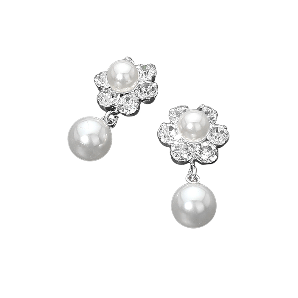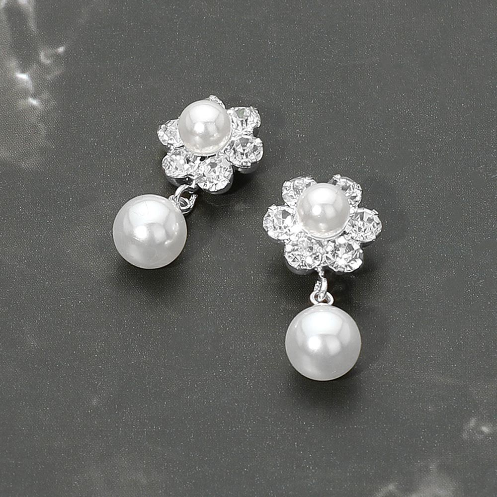 • Elegant floral pearl drop stud earrings featuring a clustered flower design accented with a smooth dangling pearl. Their timeless silhouette adds a refined, classic touch to bridal looks, formal outfits, or everyday elegance. A versatile accessory perfect for gifting and special occasions.