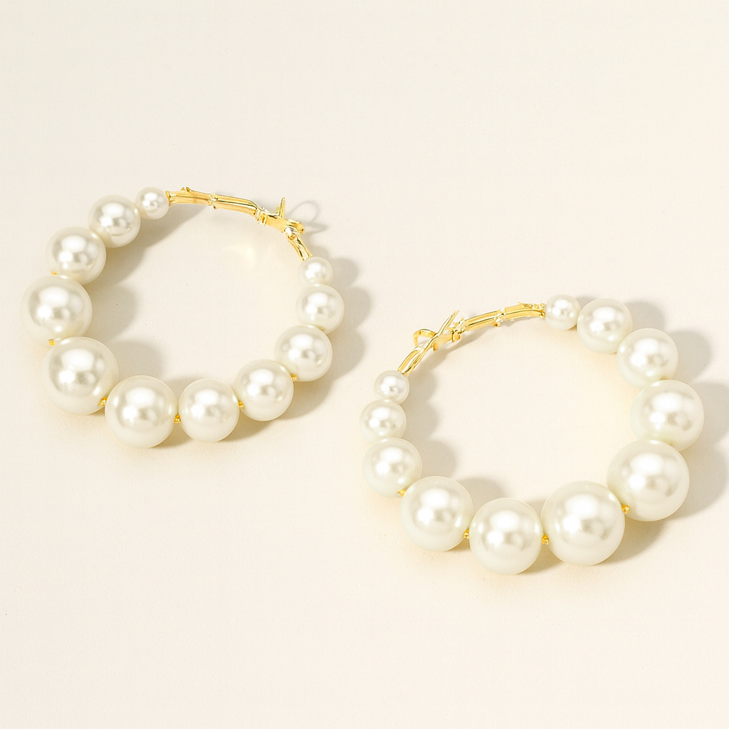 Details • Size : 2.25" X 2.25" • Omega Closure • Elevate your accessories with these bold faux pearl beaded hoop earrings featuring a playful arrangement of glossy round beads. The vibrant and dynamic design adds a fun and lively touch to your outfit, making them perfect for festivals, casual wear, or standout fashion statements. • Lead and Nickel Compliant