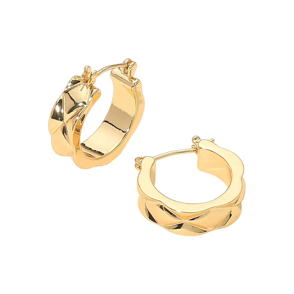 Details • Size : 0.75" X 0.75" X 0.25" • Pin Catch • Chic huggie hoop earrings featuring a quilt-inspired pattern with a polished, textured design. Their medium size offers the perfect balance of elegance and comfort, making them a versatile accessory for both everyday wear and special occasions, adding refined charm to any jewelry collection. • Brass • Gold Dipped • Hypoallergenic • Lead and Nickel Compliant • Made In Korea