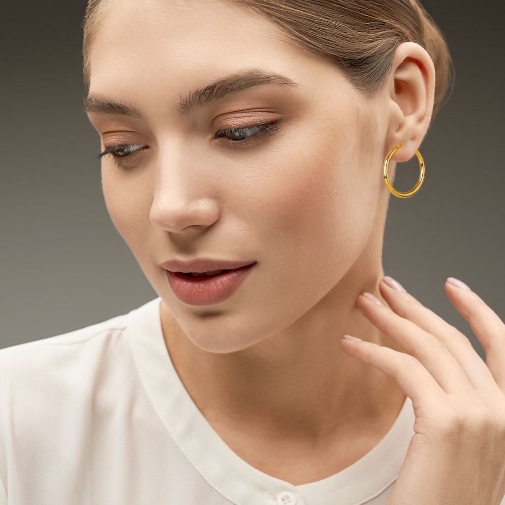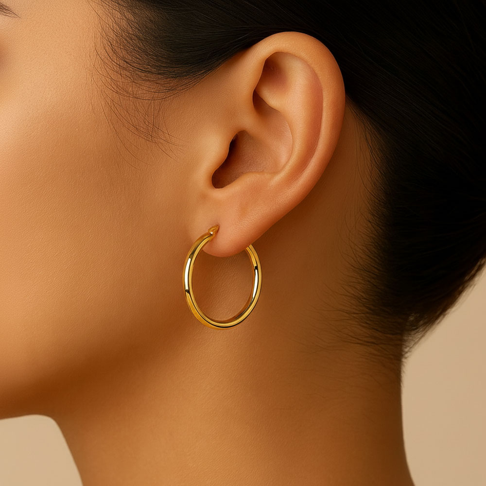 Details • Size : 1.2" X 1.2" • Pin Catch • Water resistant plating • Elegant small hoop earrings designed for effortless everyday style. Lightweight and versatile, these timeless hoops bring a polished finish to any outfit, making them the perfect accessory for both casual and professional looks. • Brass • Gold Dipped • Hypoallergenic • Lead and Nickel Compliant • Made In Korea
