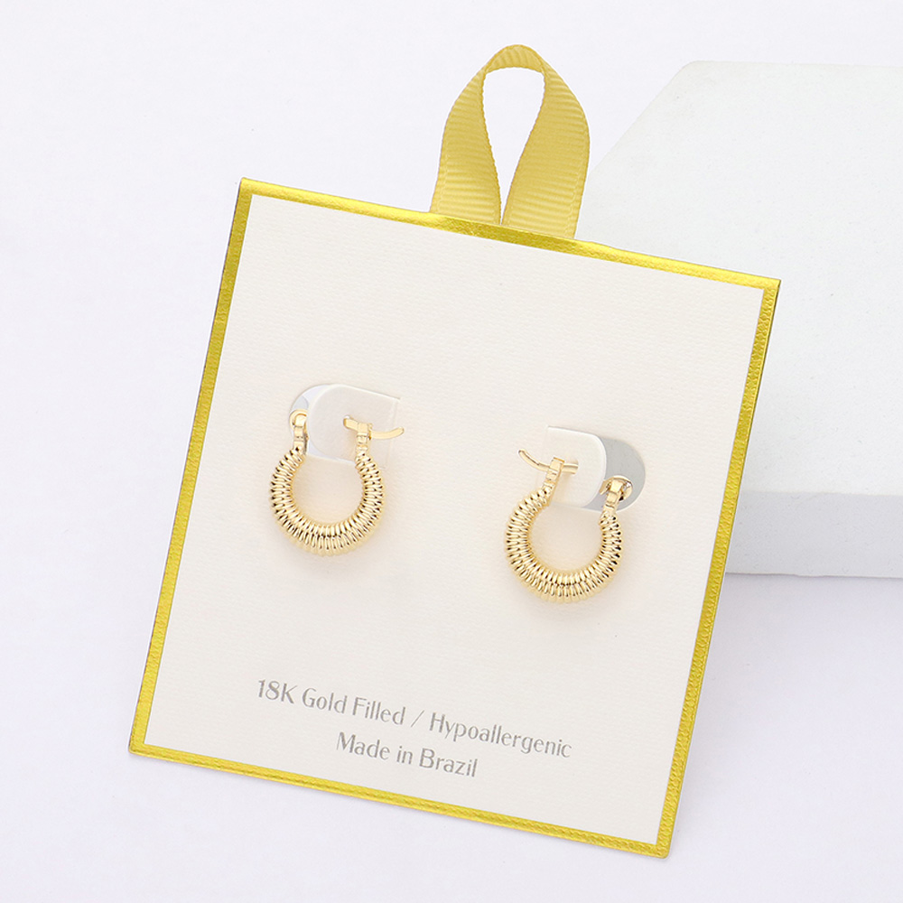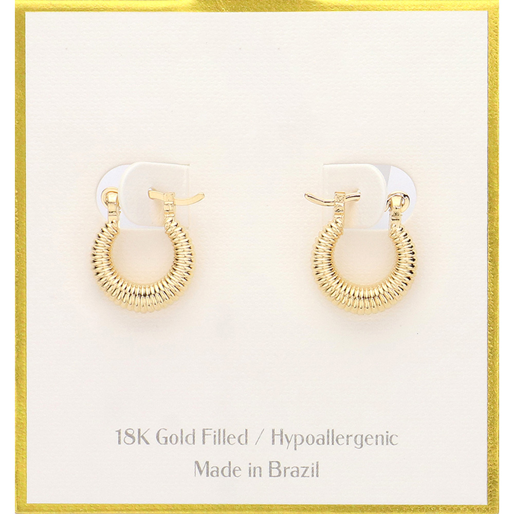 Details • Size : 0.6" X 0.7" • Pin Catch • Small hoop earrings with a ribbed texture for added detail and charm. These lightweight, hypoallergenic earrings offer comfort and timeless elegance, perfect for daily wear or subtle statement accessorizing. • Hypoallergenic • Gold Filled • Made In Brazil