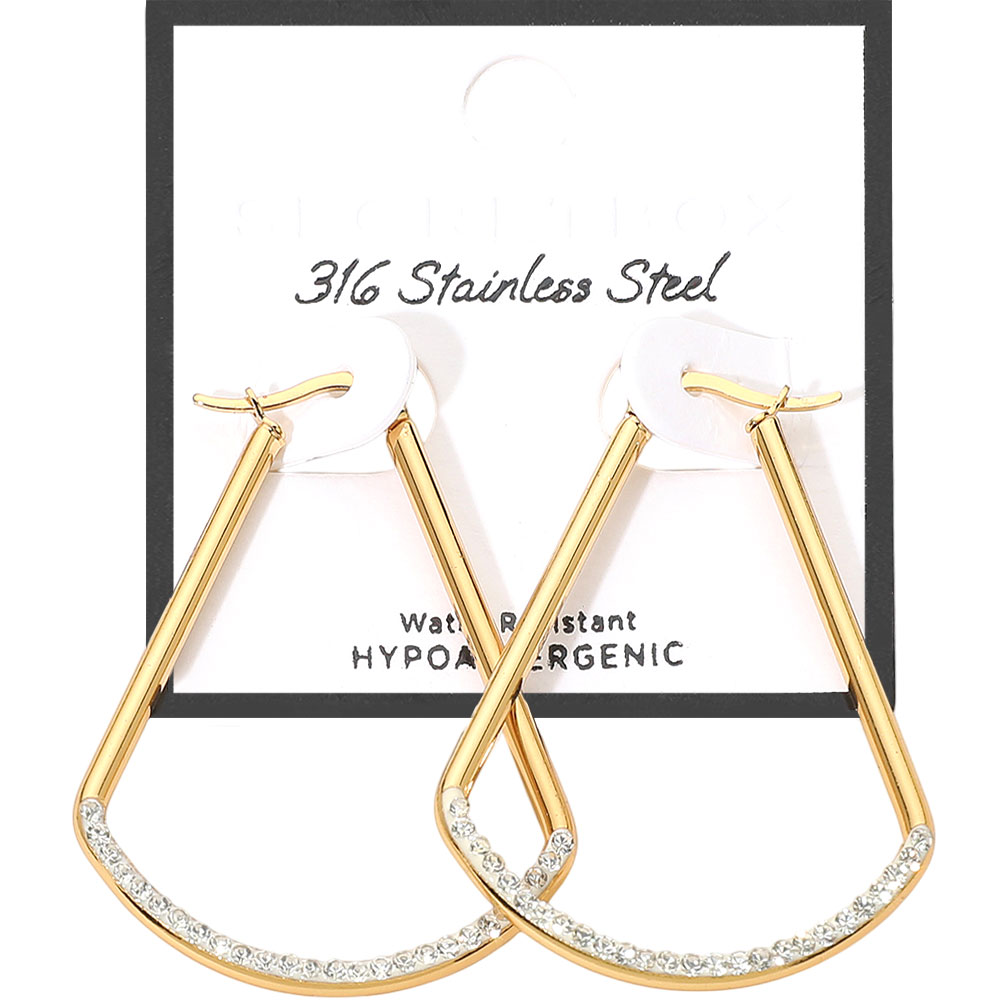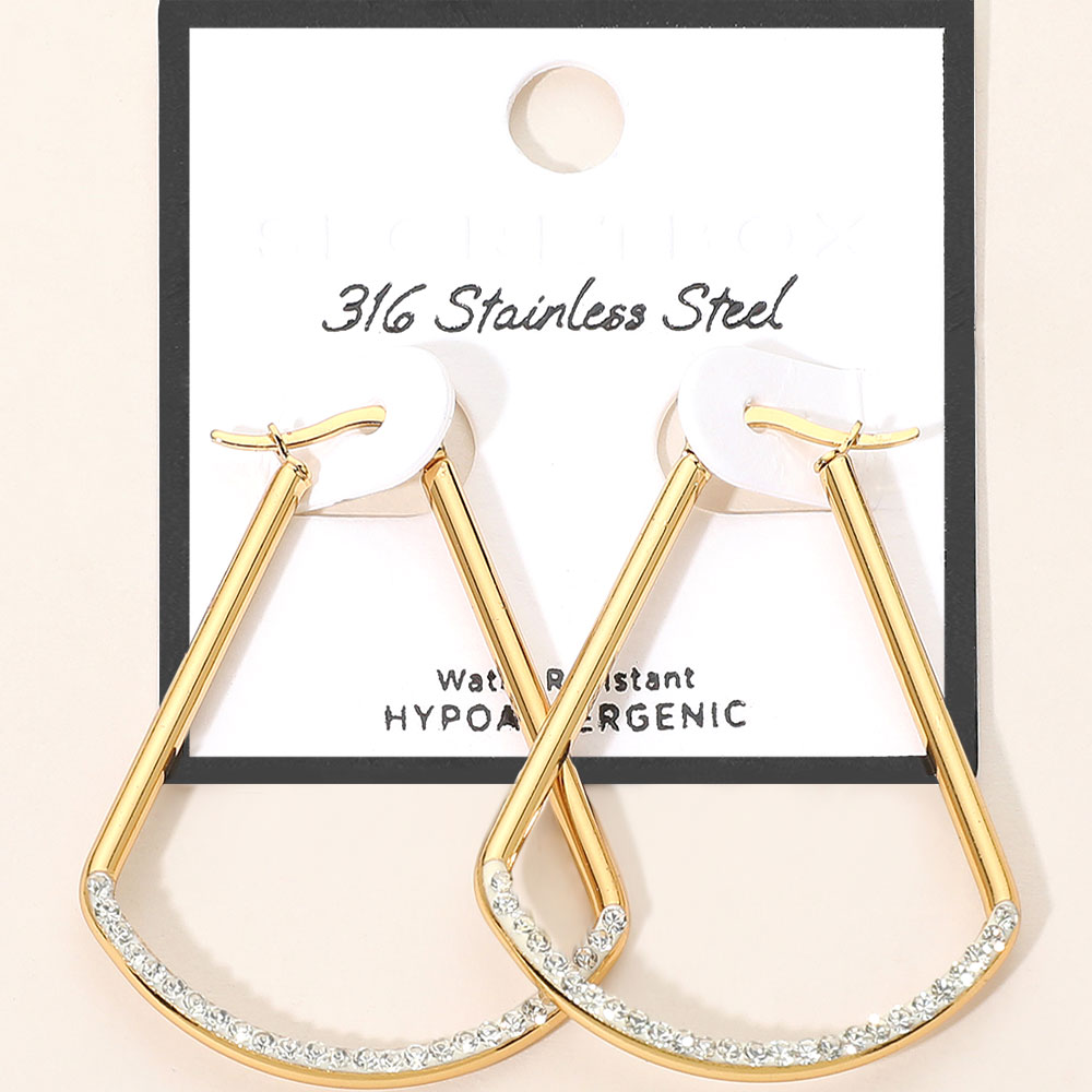 Details • Size : 1.5" X 1.8" • Pin Catch • Water Resistant • Modern teardrop hoop earrings featuring a geometric open-frame design accented with sparkling crystals. Lightweight and hypoallergenic, these stylish statement earrings offer a sleek contemporary look perfect for everyday wear or special occasions. • Hypoallergenic • Stainless Steel