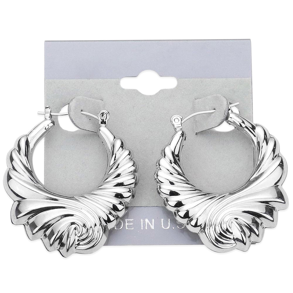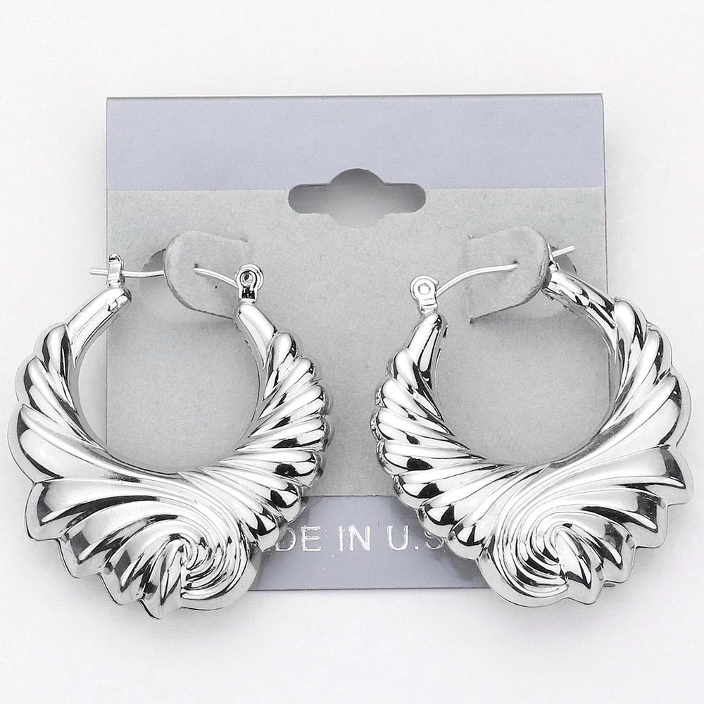 Details • Size : 1.25" X 1.4" • Pin Catch • Made In USA • Turn heads with swirl design hoop earrings featuring a bold sculpted pattern that enhances their striking silhouette. Perfect for making a statement, these hoops offer a fashionable blend of artistic flair and timeless appeal for everyday wear or special occasions.