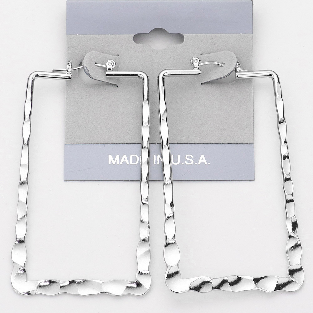 Details • Size : 1.4" X 2.6" • Pin Catch • Made In USA • Stand out with these hammered square hoop earrings featuring a bold geometric shape and textured finish. Their unique design blends modern sophistication with everyday wearability, making them an eye-catching accessory that enhances both casual and dressy looks.