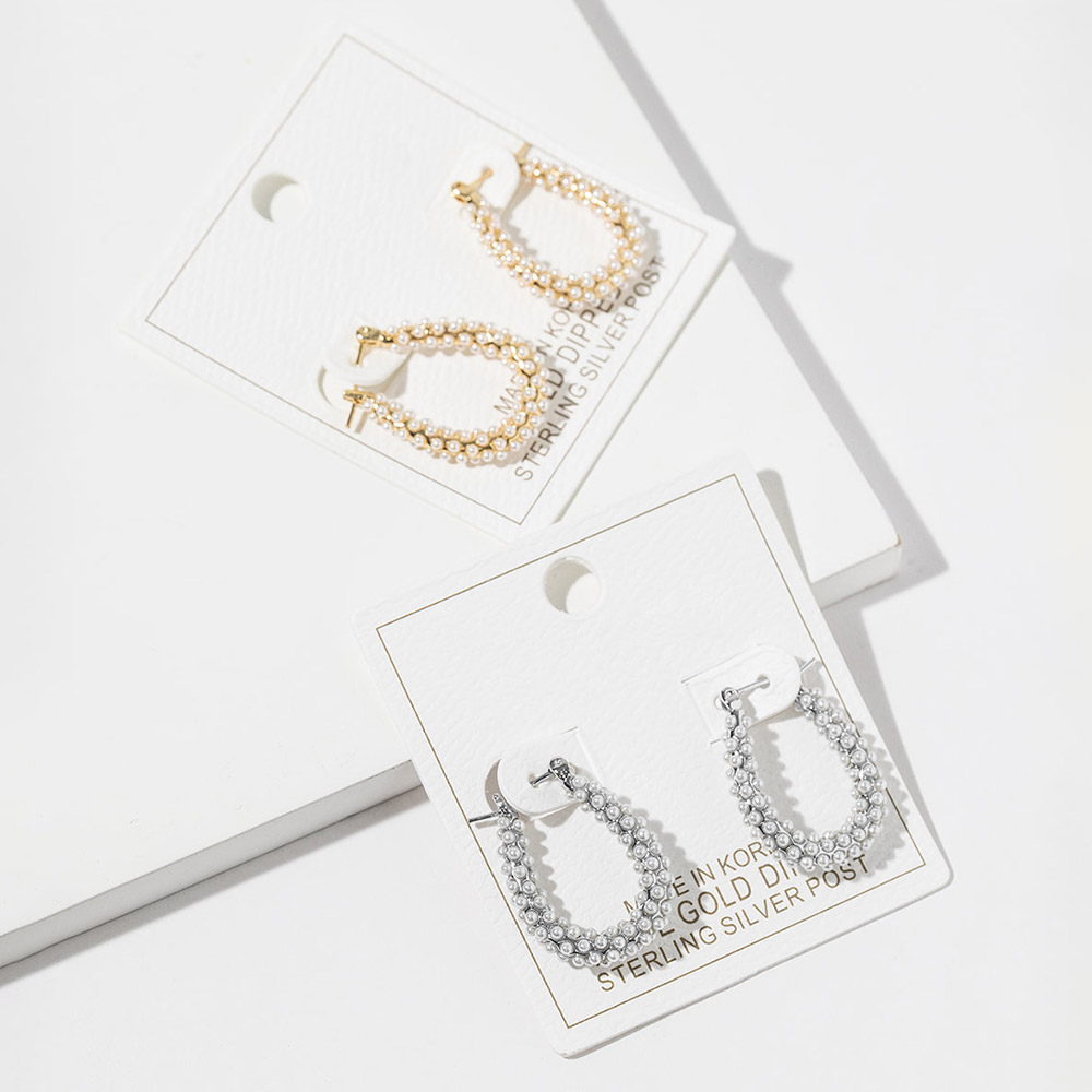 Details • Size : 0.75" X 1" • Pin Catch • Elegant pearl hoop stud earrings designed with a classic rounded silhouette and refined detailing. A timeless accessory for everyday wear, work outfits, special occasions, and gifting, these earrings offer understated sophistication, graceful style, and versatile appeal that complements both casual and dressy looks. • Gold Dipped • Lead and Nickel Compliant • Made In Korea • Sterling Silver Post