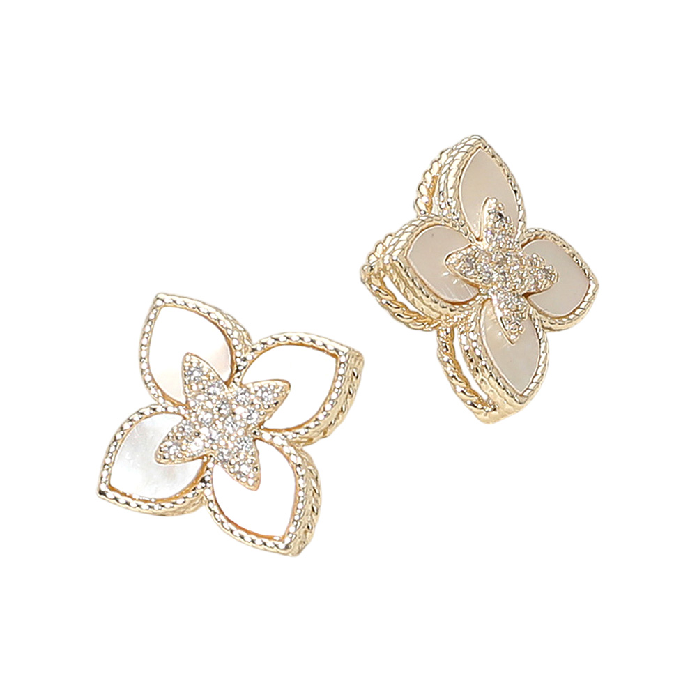 Details • Size : 0.75" X 0.75" • Post Back • Elegant and refined, these floral clover stud earrings feature intricately shaped petals adorned with shimmering crystal accents. Their timeless design brings a sophisticated touch to any look, making them perfect for both daily wear and elegant evening occasions. • Gold Dipped • CZ Cubic Zirconia