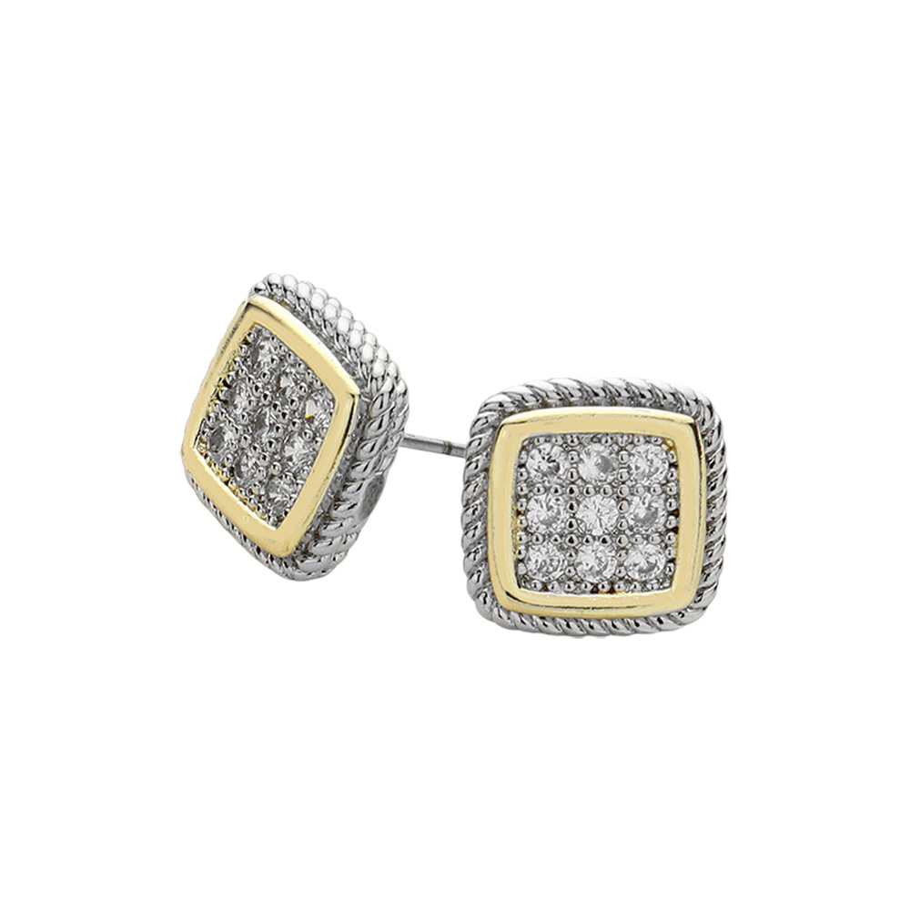 14K Gold Plated Two Tone CZ Stone Paved Square Stud Earrings