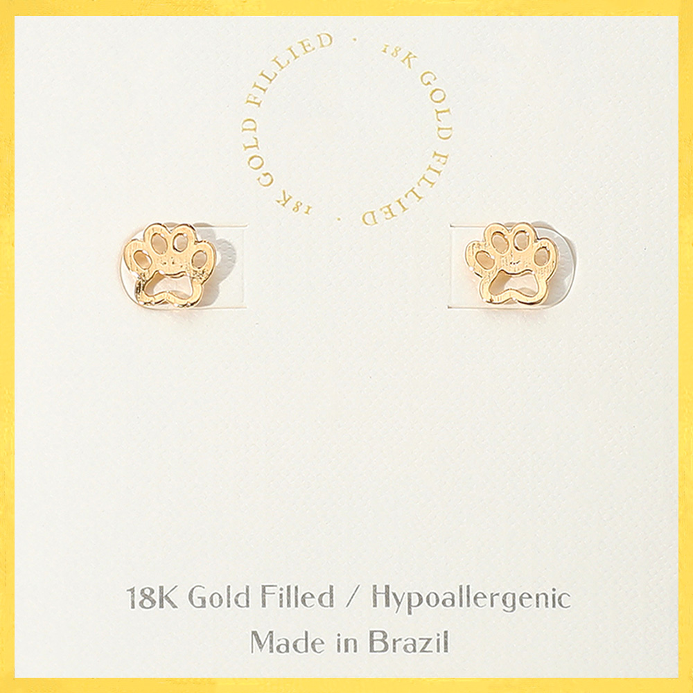 Details • Size : 0.3" X 0.4" • Post Back • Adorable paw print stud earrings crafted in 18K gold-filled material. Hypoallergenic and made in Brazil, these lightweight earrings are perfect for pet lovers, offering a playful yet elegant touch to any outfit. Great for everyday wear or as a thoughtful gift for animal enthusiasts. • Lead and Nickel Compliant • Hypoallergenic • Gold Filled • Made In Brazil
