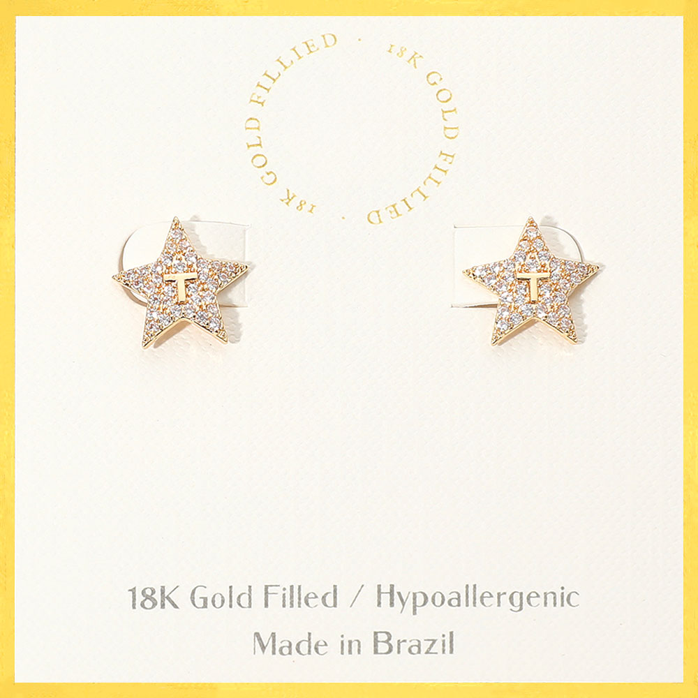 Details • Size : 0.7" X 0.7" • Post Back • Shine bright with these 18K gold filled initial T star stud earrings, detailed with sparkling crystal accents for a radiant finish. Their hypoallergenic design ensures comfort and elegance all day. Expertly made in Brazil, these studs add a touch of glamour to both casual and dressy looks. • Gold Filled • Hypoallergenic • Lead and Nickel Compliant • Made In Brazil