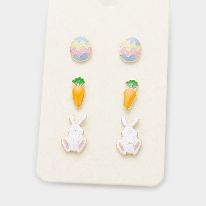 3 Pairs - Enamel bunny & carrot happy Easter stud earrings