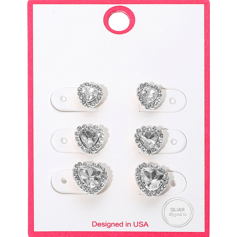 Details • Size : 0.3" - 0.5" L • Post Back • Elegant heart-shaped crystal earrings with a sparkling halo design. This set includes three sizes perfect for creating versatile, romantic looks. Ideal for everyday glam or special occasions. • Sterling Silver Dipped • Lead and Nickel Compliant