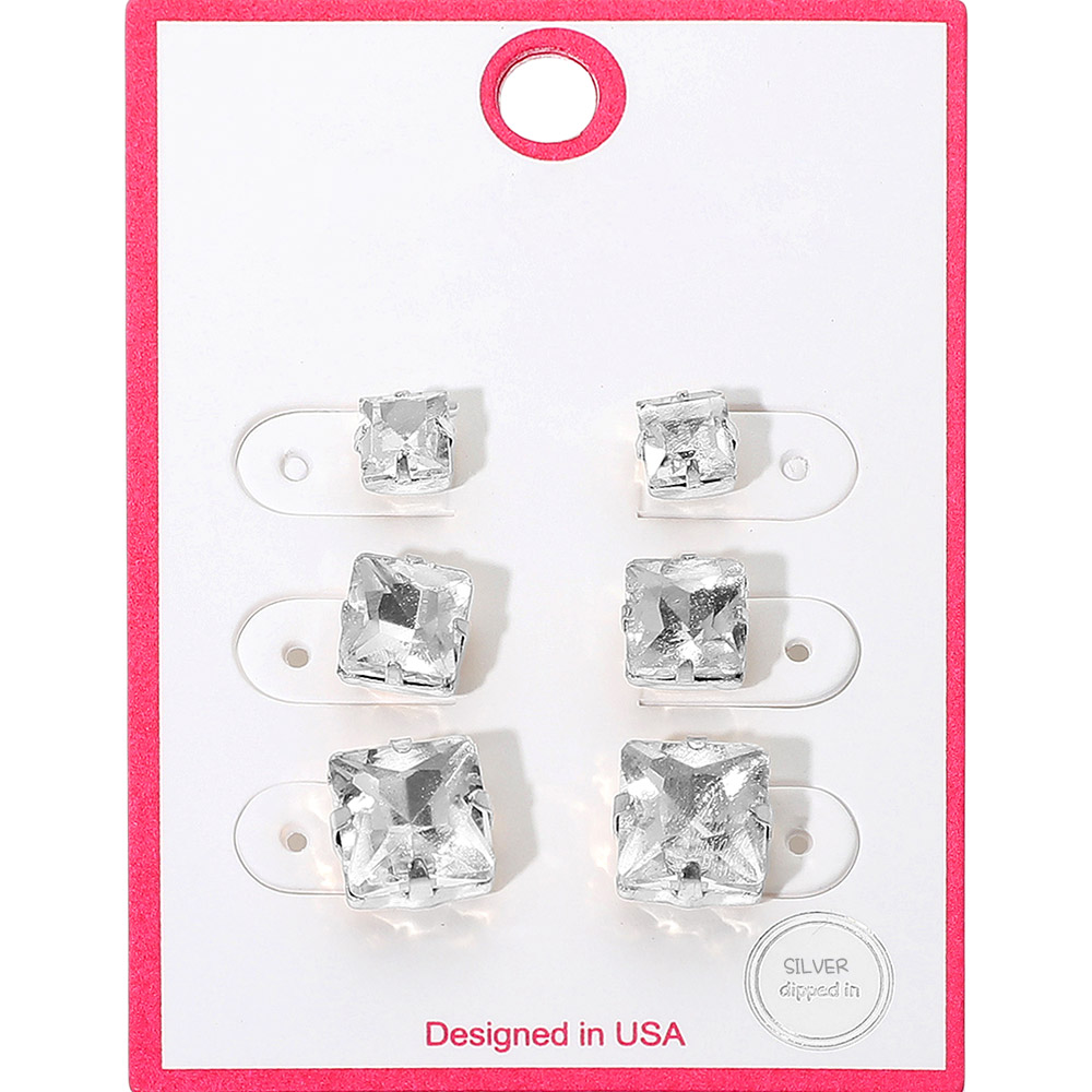 Details • Size : 0.25" - 0.4" L • Post Back • Chic square-cut stud earrings in a trio of sizes, designed to add sparkle and style to any outfit. This versatile earring set is ideal for everyday wear or layered looks, offering timeless elegance. • Sterling Silver Dipped • Lead and Nickel Compliant